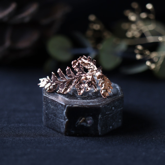 カニクサの葉を銅化したイヤーカフ w1666 庭で採取した本物のカニクサを、エレクトロフォーミング(電気メッキ)により銅で金属化したイヤーカフです。 繊細な葉が相似形に並ぶ美しい造形をそのまま銅化し、植物標本のような静かな存在感と、金属ならではの強度を両立させました。 素材である銅は、時間の経過とともに深みのある色合いへと変化し、アンティークのような風合いをお楽しみいただけます。 着けると耳から銅の葉が伸びるような、独特なバランス。 イヤーカフは耳たぶの凹凸に引っ掛けるようにして装着するため、痛くなりにくく着け心地の良いデザイン。ピアスホールの有無を問わずお楽しみいただけます。 ●カニクサ シダの仲間では珍しいつる性植物で、「ツルシノブ」とも呼ばれます。道端に自生しており夏場に良く伸びます。つるの部分は茎ではなく葉で、本当の茎は地下にあります。繊細な葉がいくつも相似形に並ぶ美しい造形。庭に生えていたものを「エレクトロフォーミング」という技法で金属化しました。 ●エレクトロフォーミングとは 植物や鉱物など、金属ではないものの表面に電気メッキをかける技術。儚く枯れてしまう植物を金属に変えることでその時間と美しさを留めることができる、錬金術のような技法です。金属の層を厚くすることにより、強度も保たれます。 ●銅の経年変化とメンテナンスについて 初めはピンクゴールドに似た色味ですが、空気中の酸素・水分・人間の汗や皮脂にって経年変化し、使い込んだアンティークのような質感に変化していきます。変化が気になる場合は、アクセサリー用の磨き布、金属磨き液などを使えば、輝きが蘇ります。経年変化も味わいながらお楽しみいただければ何よりです。 ●森林保護を行う団体に寄付します 自然のものを利用させていただく感謝として、森林保護に貢献します。こちらの商品の売上の5%を、世界で森を守るため、森林資源の調査研究・植林を行う団体に寄付します。 素材:カニクサ(銅メッキ)・銅 サイズ:トップ縦22mm 横27mm / カフ内径12mm程度 ※画像のイヤーカフをお届けします。 ※着用画像はイメージです。 ○再販について 売り切れた場合は順次再販します。「再入荷通知を希望する」ボタン、または「♡お気に入り」ボタンを押してお待ちください。