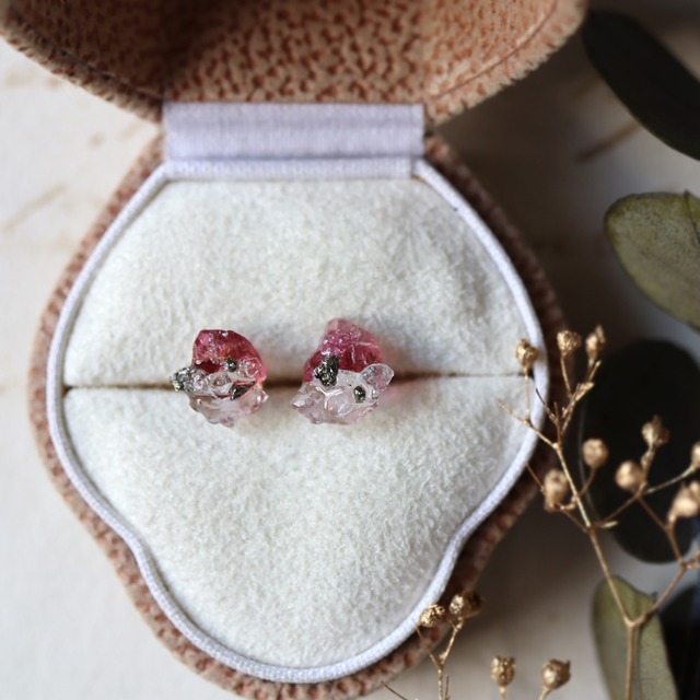 原石ピンクトルマリンとクォーツのピアス w1738 原石のピンクトルマリン・クォーツ・パイライトが共生し結晶した、創造上の鉱物「Unionite」のミニピアス。 果実のように鮮やかなピンク色のトルマリン。結晶そのままの幾何学的な形と透明感のあるクォーツ。金属光沢の微小なパイライト。表情の違う鉱物の小さな結晶が共生し響き合います。 金具部分はK14ゴールドフィルドという変色やアレルギーが出にくい素材。ご使用後のメンテナンスや修理も承っています。 普段使いにもおすすめな、小さめピアスです。小粒ながら、天然石らしい華やかな存在感で耳元を飾ります。 【Unionite(ユニオナイト)】 自然界には存在しない"共生結晶"を表現した創造鉱物。全て本物の鉱物を使用しています。 ●使用している石・素材について ○トルマリン トルマリンはシンハラ語で「豊富な」という意味を持つ石で、その名の通り色数がとても豊富です。無色透明なものからピンク、緑、黄色、紫、青色など様々な色合いがあります。結晶を熱すると電気を帯びるため、「電気石」とも呼ばれ広く使われています。 ○クォーツ 世界中で産出され、古くから装飾品や通貨・薬としても使用されてきたクォーツ。「石英」という鉱物が無色透明に結晶化したもので、和名は「水晶」です。 ○パイライト ハンマーでたたくと火花が飛び散ることから、ラテン語のpyrites(火打石)から名付けられました。原石は火山活動が活発な地域で生成され、金属的な立方体や八面体の結晶になります。 ○K14GF(ゴールドフィルド) ゴールドフィルドは、一般的なメッキよりもはるかに厚い金の層を、高い圧力で圧着したものです。変色や金属アレルギーが起きにくい素材です(個人差があります) 素材:ピンクトルマリン(ナイジェリア産)・クォーツ(モロッコ産)・パイライト・K14ゴールドフィルド サイズ:トップ縦8mm 横7mm ※原石を使用しているため、個体差があります。 ※1組(2個)セットの価格です。 ※着用画像はイメージです。 ※イヤリングへの変更はオプションをご選択ください(ゴールドプレート/ネジばね式)