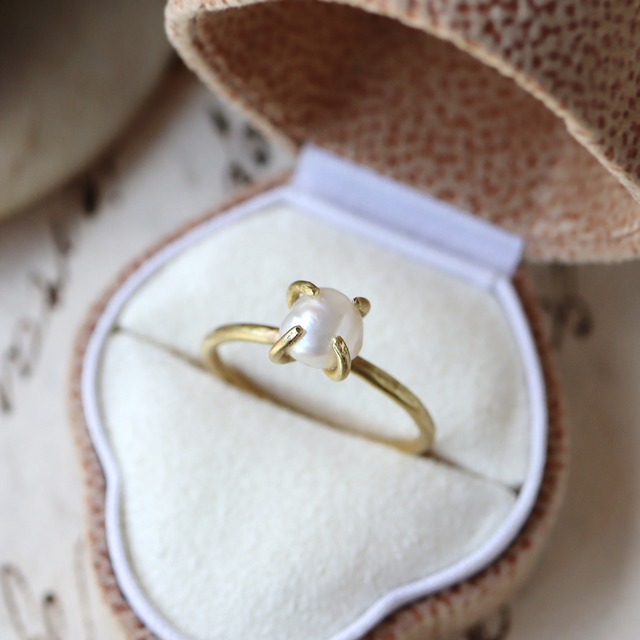淡水パールの真鍮リング w1241 自然な丸みと上品な艶が印象的な淡水パール。 小さなパールを真鍮の爪で留めた、シンプルなリングです。 パールの素朴な表情、真鍮のあたたかいゴールド色で、ナチュラルな雰囲気に仕上げました。 パールを爪で抱えるようなデザインなので、普段使いにも心配のない強度になっています。 さり気ないボリューム感は、1本でも重ね着けにもおすすめ。 さらっと合わせるだけで、ご自分らしい輝きをプラスしてくれるアイテムです。 素材:パール・真鍮 サイズ:石縦4mm 横6mm程度 リング部分線径1.5mm 制作可能サイズ:1号~20号 ※オプションからご希望のリングサイズを選んでご注文ください。 ※原石を使用している商品のため、石の形・大きさ・色などに個体差があります。 ※パールの側面に小さな穴が空いています。ご了承の上ご注文ください。 ※サイズを合わせてお作りするため、不良品以外の返品はお断りしております。 ※作りの関係上、サイズ直しは出来ませんのでご了承ください。 ●使用している石・素材について ○パール 「月のしずく」「人魚の涙」と呼ばれるほど美しく、古くから宝石として重宝されています。昔から多くの女性に愛され、クレオパトラがパールを酢に溶かして飲んだ話は有名です。 世界中の海や湖で採取されており、その色や形、輝きは貝の育つ環境や母貝によって大きく違います。古代では薬としても使われており、日本でも解熱剤として使われていたそうです。 ○真鍮 色味の濃い金色と、あたたかい質感が魅力的な素材です。はじめはゴールドのように明るい金色で光沢がありますが、使い込むうちにアンティークのような風合いに変化していきます。 市販の貴金属磨きなどで磨いていただくと元の状態に戻ります。時間の経過と共に落ち着いた色味へと変化していく、使用感が楽しめる素材です。