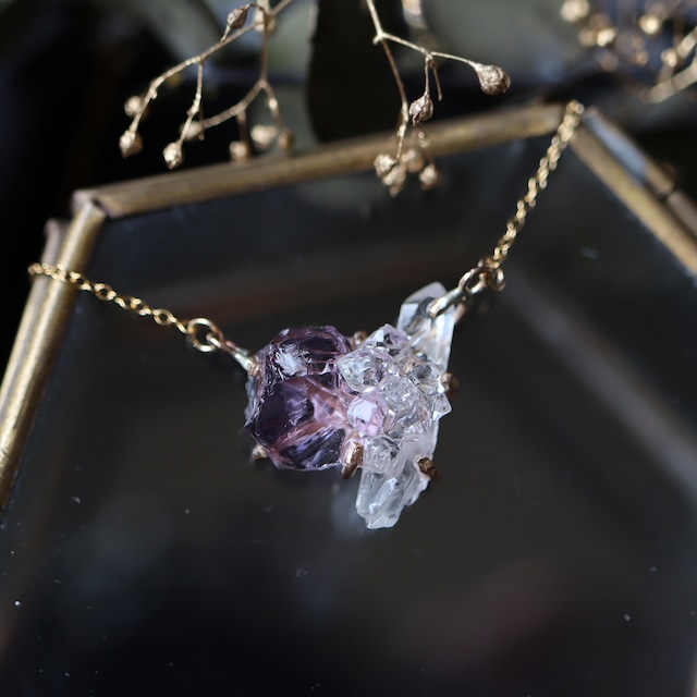 アメジストとクォーツのネックレス w1721 表情の違う三種類の水晶が共生して結晶した、創造上の鉱物「Unionite」のネックレス。 淡い紫色と透明感が美しいアメジスト、六角柱の鉛筆型に育ったクォーツ、ころんと尖った結晶と強い輝きのダイヤモンドクォーツ。それぞれ表情の違う鉱物が共生し、ひとつの鉱物標本になったようなデザインです。 金色の爪で有機的に石を留めることで、光を最大限取り込み胸元できらりと輝きます。金具とネックレス部分は変色やアレルギーが出にくいK14ゴールドフィルドを使用しており、長くきれいな状態でお使いいただけます。 地球が生み出した原石の美しさを、ファッションとして楽しめるアクセサリー。空想の鉱物標本がかもす独特な存在感が、装いに余韻を残します。 使用した鉱物について記載したカードも同封しますので、ギフトにもおすすめです。 また、ご使用後のメンテナンスなども承っています。 ●使用している石・素材について ○アメジスト 和名は「紫水晶」で、石英の結晶に微量に含有された鉄イオンにより紫色に発色します。ガラス質の透明度の高い石で、淡いライラック色から濃紫色まで幅広い色合いがあります。色の帯やムラができやすいことも特徴。 ○クォーツ 世界中で産出され、古くから装飾品や通貨・薬としても使用されてきたクォーツ。「石英」という鉱物が無色透明に結晶化したもので、和名は「水晶」です。クォーツの魅力は水のように透き通った透明度。六角柱のえんぴつ型に育った結晶も人気があります。 ○ダイヤモンドクォーツ 両剣・両錘(両端がとがった形)の結晶、ダイヤモンドのような強い輝きを放つ水晶。他の水晶よりも高温・高圧の環境で成長するため、カーボンと言われる小さな黒い内容物や気泡を内包するものも多くあります。 ○K14GF(ゴールドフィルド) ゴールドフィルドは、一般的なメッキよりもはるかに厚い金の層を、高い圧力で圧着したものです。長時間使用しても剥げてくることはほとんどありません。また、金属アレルギーの原因であるニッケルやスズを使用していないため、アレルギーが出にくい素材でもあります(個人差があります) 素材:アメジスト・クォーツ(マダガスカル産)・ダイヤモンドクォーツ(パキスタン産)・K14ゴールドフィルド(爪・ネックレス) サイズ:トップ縦17mm 横20mm / 全長40cm+5cmアジャスター