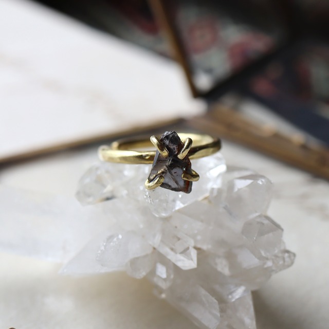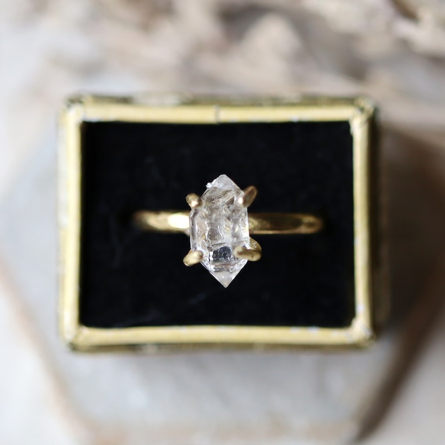 原石ダイヤモンドクォーツのイヤーカフ/リング won2 ダイアモンドのような高い透明度と強い輝きが美しい、ダイヤモンドクォーツのイヤーカフ。 ぶら下がりパーツを付けたり、リングにしたり、3wayでお使いいただけます。 シンプルなのでシリーズの他のデザインとの重ね着けもおすすめ。 表面はハンマーで叩いたナチュラルな質感で、使い込むほどに風合いが変化していきます。 組み合わせ色々で自分らしく楽しめるアイテムです。 素材:ダイヤモンドクォーツ(パキスタン産)・真鍮 サイズ:石部分縦10mm 横5mm リング部分線径2mm 内径16mm リングサイズ:1~20号まで制作可能。オプションからご希望のサイズをご選択ください。 ※原石を使用している商品のため、石の形・大きさ・質感などに個体差があります。 ※着用画像はイメージです。実際の色味や質感は、商品単体写真をご確認ください。 シリーズの他のアイテム・イヤーカフの付け方についてはこちら →https://www.witch.rest/blog/2020/09/13/212444 ●使用している素材について ○ダイヤモンドクォーツ 両剣・両錘(両端がとがった形)、ダイヤモンドのようなとても強い輝きを放つ水晶。水晶は艶や光沢がなくさらっとした輝きのものがほとんとですが、ダイヤモンドクォーツは原石として産出された無加工の状態で、ダイアモンドのような硬質な輝きがあります。 他の水晶よりも高温・高圧の環境で成長するため、カーボンと言われる小さな黒い内容物や気泡を内包するものも多くあります。特にニューヨーク州ハーキマー地区で産出されるものは美しく、ハーキマーダイヤモンドと呼ばれています。 ○真鍮 色味の濃い金色と、あたたかい質感が魅力的な素材です。はじめはゴールドのように明るい金色で光沢がありますが、使い込むうちにアンティークのような風合いに変化していきます。 市販の貴金属磨きなどで磨いていただくと元の状態に戻ります。時間の経過と共に落ち着いた色味へと変化していく、使用感が楽しめる素材です。