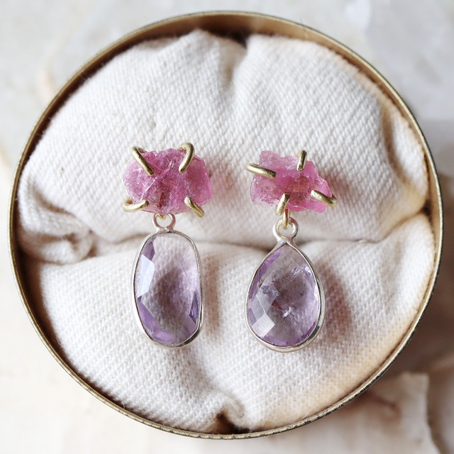2way:原石のトルマリンとアメジストのピアス