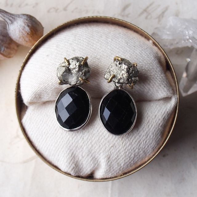 2way:原石のパイライトとオニキスのピアス