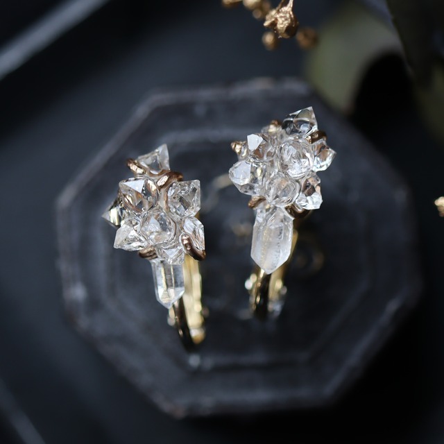 クォーツとダイヤモンドクォーツのピアス w1627-Unionite138 表情の違う二種類の水晶が共生して結晶化した、創造上の鉱物「Unionite」のイヤリング。 六角柱の鉛筆型に育ったマダガスカル産のクォーツを母岩に、両端がとがったころんとした形、輝きの強いダイヤモンドクォーツが花開くように結晶しました。 どちらも無色透明ですが、純度の高い氷を切り出したような凛とした存在感があります。 金色の爪で有機的に石を留めることで、光を最大限取り込み耳元できらきらと輝きます。地球が生み出す芸術品のような原石を、ファッションとして楽しめるアイテムです。 より長く楽しんでいただけるよう、強度にもこだわっています。トップ自体を金属の爪で囲っているので、強度はしっかりしています。また、金具部分はK14ゴールドフィルドという変色やアレルギーが出にくい素材を使用しています。ご使用後のメンテナンスや修理も承っています。 【Unionite(ユニオナイト)】 共生し結晶化した創造上の鉱物。全て本物の鉱物を使用しています。 ●使用している石・素材について ○クォーツ 世界中で産出され、古くから装飾品や通貨・薬としても使用されてきたクォーツ。「石英」という鉱物が無色透明に結晶化したもので、和名は「水晶」です。クォーツの魅力は水のように透き通った透明度。六角柱のえんぴつ型に育った結晶も人気があります。 ○ダイヤモンドクォーツ 両剣・両錘(両端がとがった形)の結晶、ダイヤモンドのような強い輝きを放つ水晶。他の水晶よりも高温・高圧の環境で成長するため、カーボンと言われる小さな黒い内容物や気泡を内包するものも多くあります。 ○K14GF(ゴールドフィルド) ゴールドフィルドは、一般的なメッキよりもはるかに厚い金の層を、高い圧力で圧着したものです。長時間使用しても剥げてくることはほとんどありません。また、金属アレルギーの原因であるニッケルやスズを使用していないため、アレルギーが出にくい素材でもあります(個人差があります) 素材:クォーツ(マダガスカル産)・ダイヤモンドクォーツ(パキスタン産)・K14ゴールドフィルド(ピアス爪)・ゴールドプレート(ネジばね式イヤリング) サイズ:トップ縦15mm 横10mm程度 ※画像のイヤリング(1組)をお送りします。