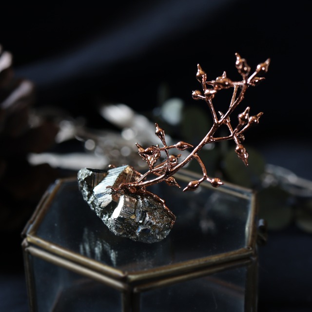 パイライトとユーカリ ws649 ●パイライト(ペルー産/Huanzala,Ancash)Pyrite にぶい金色と独特の金属光沢が美しいパイライト。ゴールドと間違われることも多く「愚者の黄金」とも呼ばれます。ハンマーでたたくと火花が飛び散ることから、古代では火打石としても使われていたそうで、ラテン語の「火打石」という言葉から名付けられました。原石は火山活動が活発な地域で生成され、整った立方体や八面体の結晶になります。 ●ユーカリ Eucalyptus オーストラリア原産でコアラの食べ物として知られているユーカリ。900近くの種類があり形も様々ですが、細長い葉をつけるカマルドレンシスという種のつぼみと葉を使用しました。枝をうねうねと伸ばして粒々を付ける様子は粘菌のよう(運動し微生物を捕食し、胞子によって繁殖する、動物とも植物ともつかないアメーバのような原子生物) 【花石】 銅化した本物の植物と鉱物を使ったアートオブジェ。 全ての作品にシリアルナンバーが付いており、オリジナルの箱と鉱物植物に関する説明書を同封します。 ●エレクトロフォーミングとは 植物や鉱物など、金属ではないものの表面に電気メッキをかける技術。儚く枯れてしまう植物を金属に変えることでその時間と美しさを留めることができる、錬金術のような技法です。金属の層を厚くすることにより、強度も保たれます。 ●銅の経年変化とメンテナンスについて 初めはピンクゴールドに似た色味ですが、空気中の酸素・水分・人間の汗や皮脂にって経年変化し、使い込んだアンティークのような質感に変化していきます。変化が気になる場合は、アクセサリー用の磨き布、金属磨き液などを使えば、輝きが蘇ります。経年変化も味わいながらお楽しみいただければ何よりです。 ●森林保護を行う団体に寄付します 自然のものを利用させていただく感謝として、森林保護に貢献します。こちらの商品の売上の5%を、世界で森を守るため、森林資源の調査研究・植林を行う団体に寄付します。 素材:パイライト(ペルー産/Huanzala,Ancash)・ユーカリ(銅メッキ) サイズ:高さ72mm 横50mm 厚30mm 送料無料(ゆうパック)