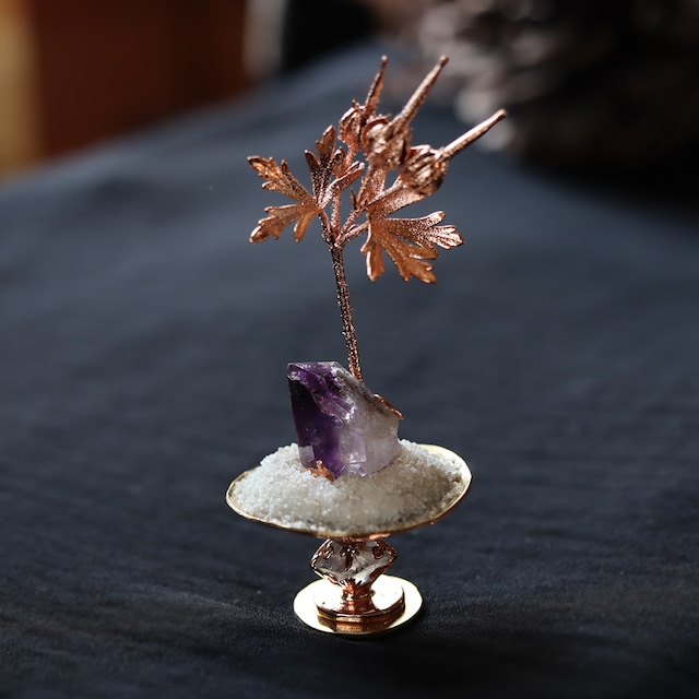 種/アメジストとアメリカフウロ ws633 ●アメジスト Amethyst 和名は「紫水晶」で、石英の結晶に微量に含有された鉄イオンにより紫色に発色します。ガラス質の透明度の高い石で、淡いライラック色から濃紫色まで幅広い色合いがあります。色の帯やムラができやすいことも特徴で、中心で二色に分かれる様子が見られます。水晶特有の六角柱の鉛筆型に育った美しい形の結晶。 ●アメリカフウロ Geranium carolinianum 北アメリカ原産の帰化植物。日本では1932年京都で発見されて以来、高い繁殖力と環境適応力により全国的に広がり道端などでよく見かける野草です。尖っているのは果実で、根本の膨らんだ部分に種が入っています。葉は掌を広げたような形が美しく、春の終わりに紅葉します。羽根を広げるツルのようにも見える美しい造形です。 【花石】 銅化した本物の植物と鉱物を使ったアートオブジェ。 全ての作品にシリアルナンバーが付いており、オリジナルの箱と鉱物植物に関する説明書を同封します。 ●エレクトロフォーミングとは 植物や鉱物など、金属ではないものの表面に電気メッキをかける技術。儚く枯れてしまう植物を金属に変えることでその時間と美しさを留めることができる、錬金術のような技法です。金属の層を厚くすることにより、強度も保たれます。 ●銅の経年変化とメンテナンスについて 初めはピンクゴールドに似た色味ですが、空気中の酸素・水分・人間の汗や皮脂にって経年変化し、使い込んだアンティークのような質感に変化していきます。変化が気になる場合は、アクセサリー用の磨き布、金属磨き液などを使えば、輝きが蘇ります。経年変化も味わいながらお楽しみいただければ何よりです。 ●森林保護を行う団体に寄付します 自然のものを利用させていただく感謝として、森林保護に貢献します。こちらの商品の売上の5%を、世界で森を守るため、森林資源の調査研究・植林を行う団体に寄付します。 素材:アメジスト・アメリカフウロ・真鍮・フローライト サイズ:高さ90mm 横40mm 厚34mm 送料無料(ゆうパック)