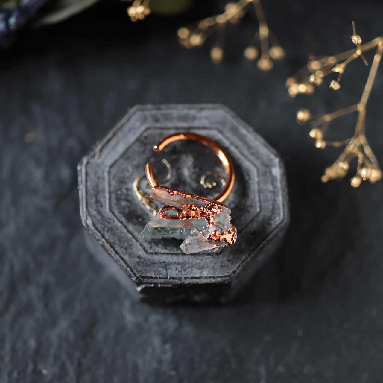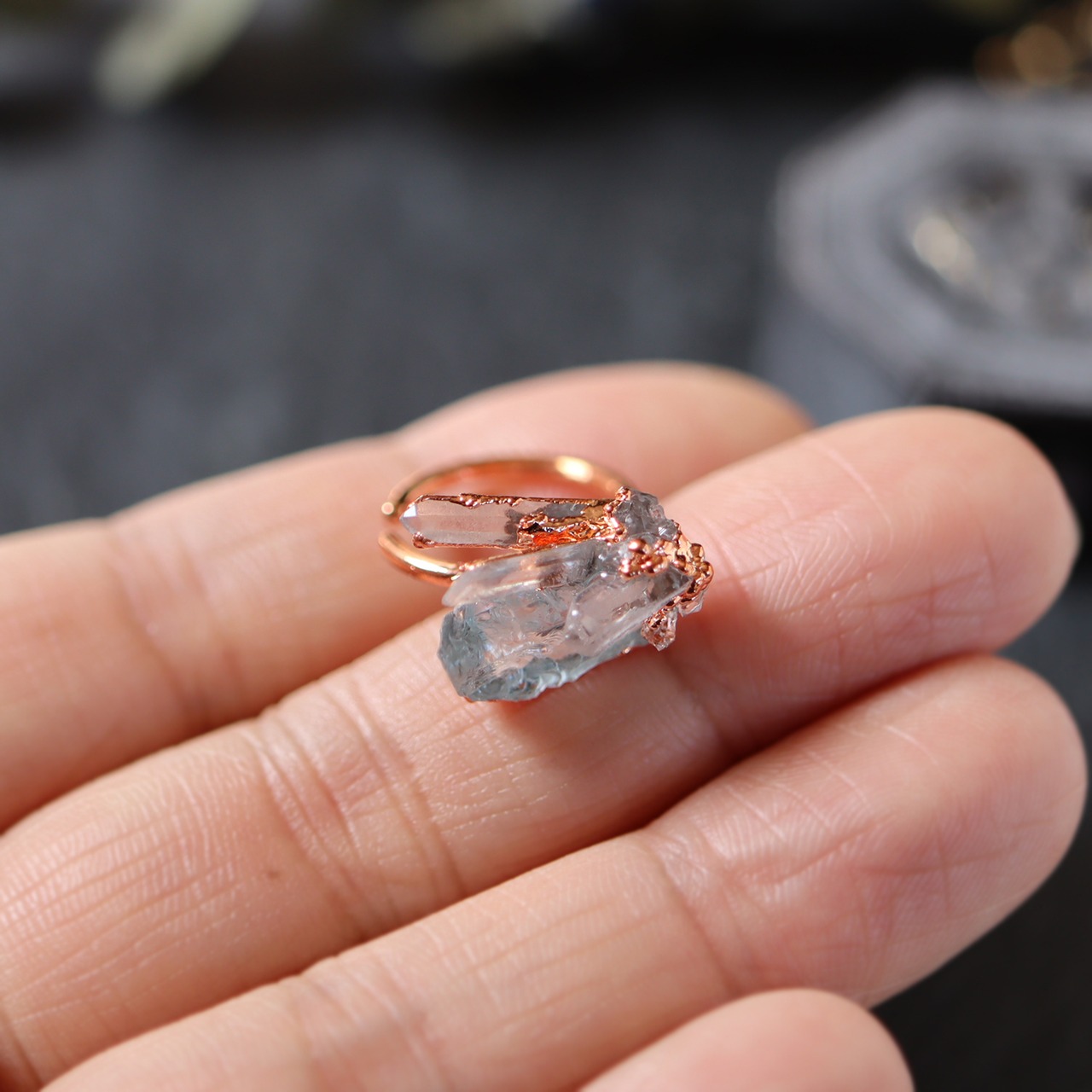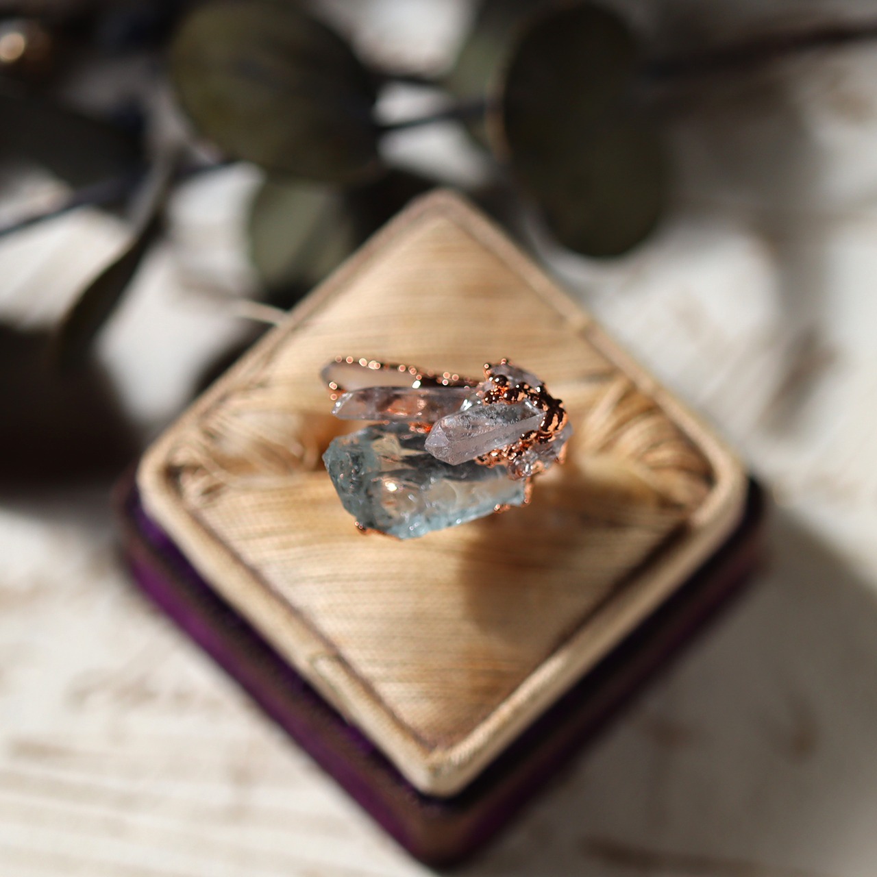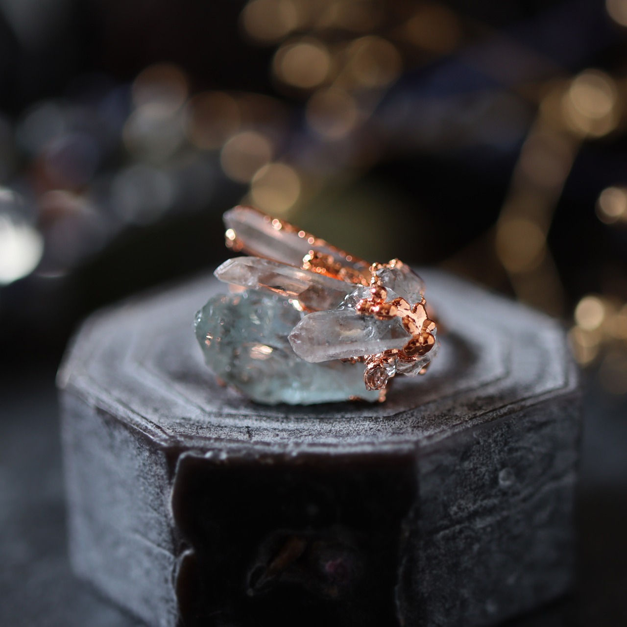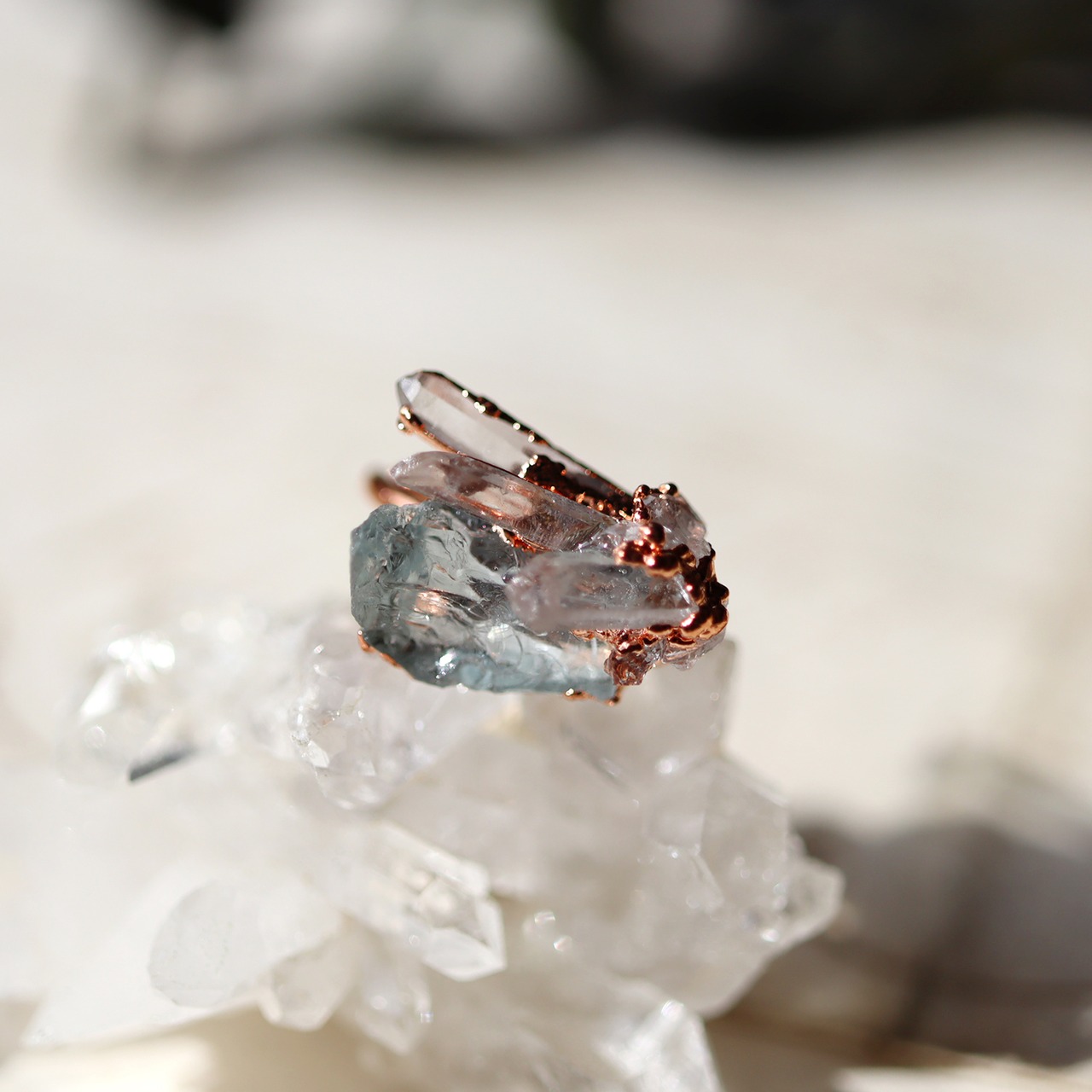 素材:アクアマリン(ナイジェリア産)・クォーツ(マダガスカル産)・クォーツクラスター(モロッコ産)・銅