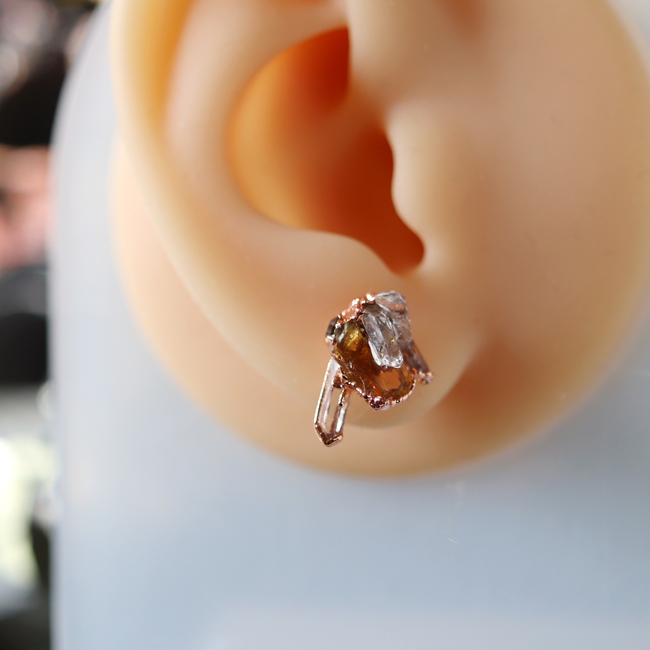 シトリンを母岩にクォーツとダイヤモンドクォーツが結晶を伸ばす、創造上の鉱物「Unionite」のピアス。
