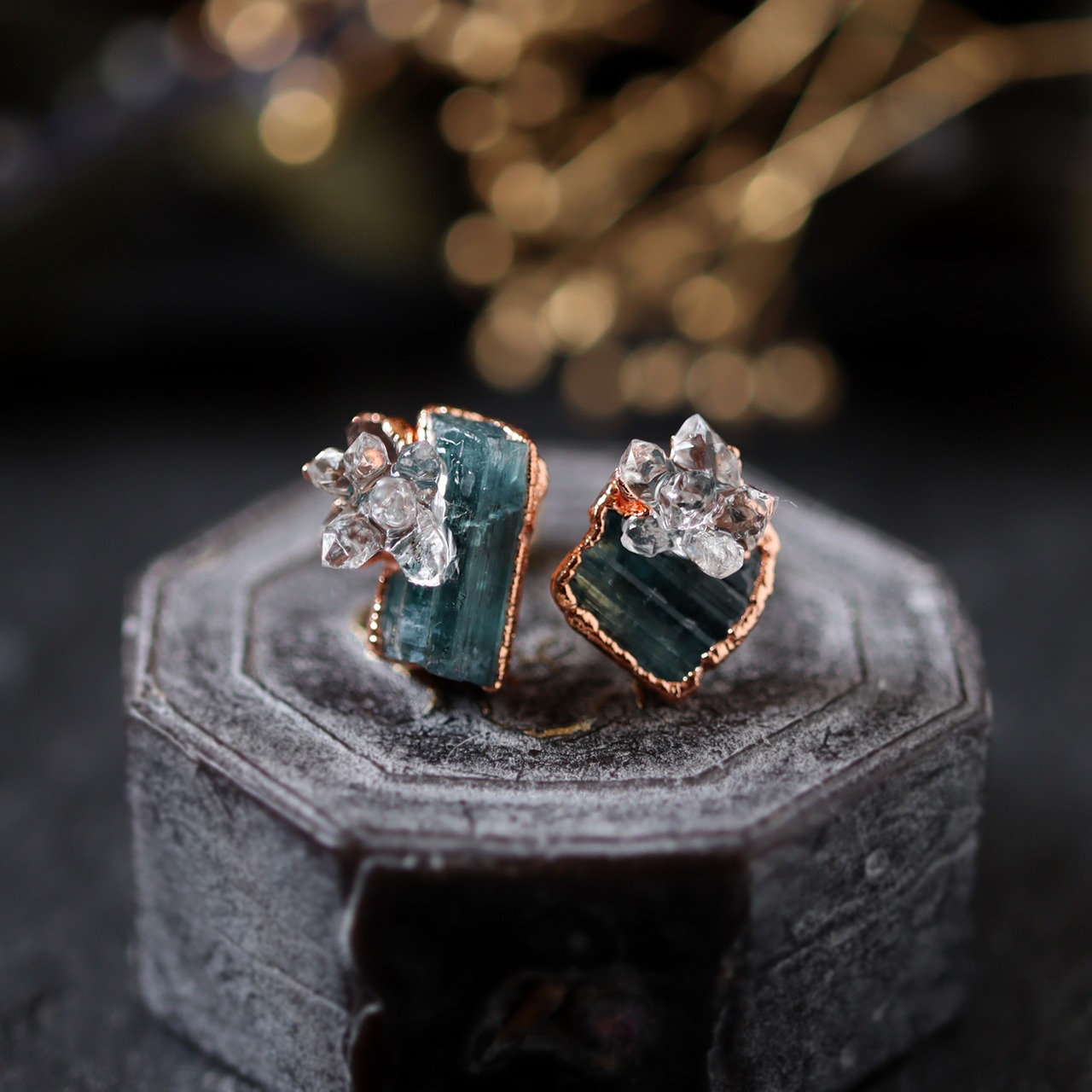 素材:ブルートルマリン(アフガニスタン産)・ダイヤモンドクォーツ(パキスタン産)・銅・K14ゴールドフィルド(ピアス針・キャッチ)