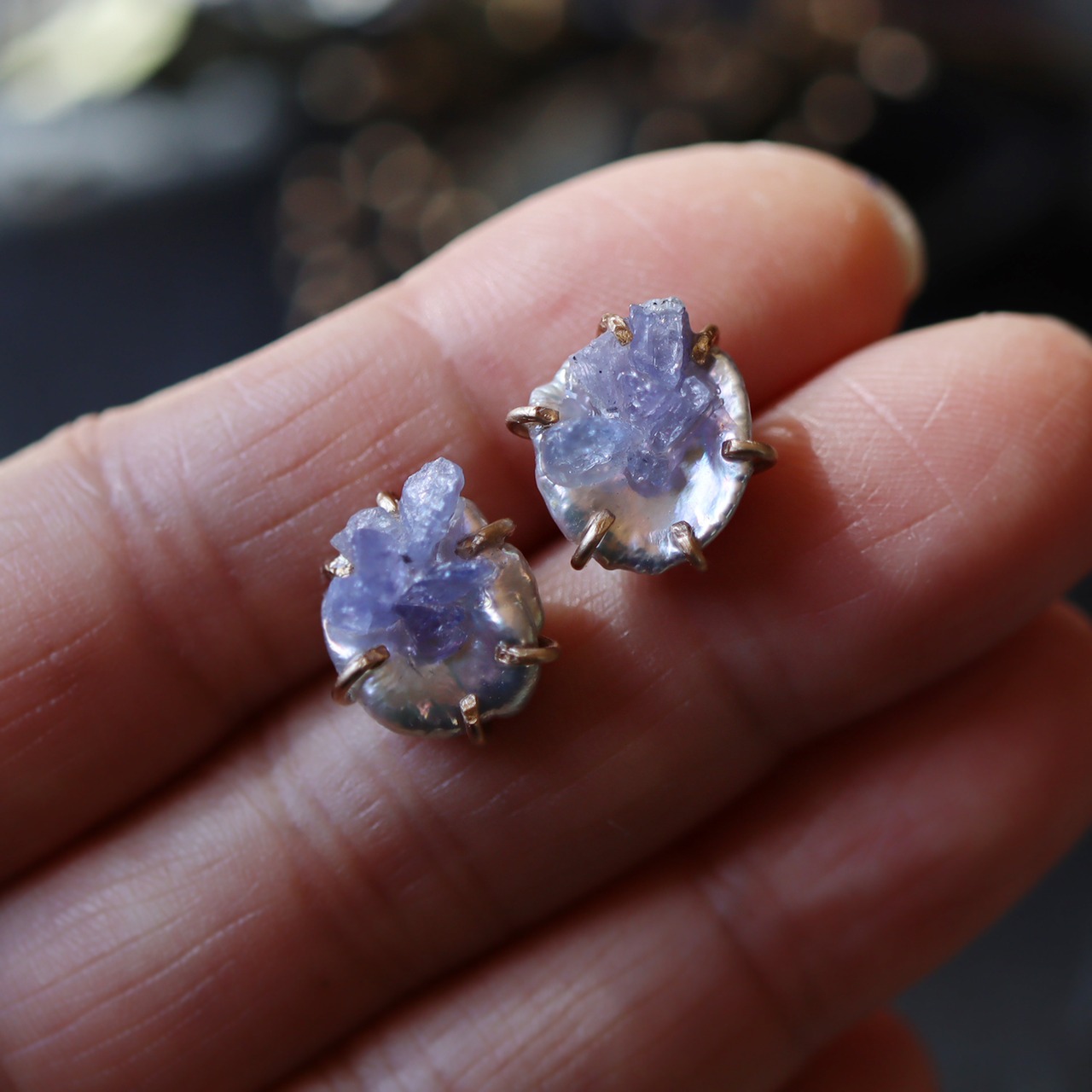 上品な艶とユニークな形が楽しめるパール。タンザナイトは結晶が折り重なるような透明感の美しい、小さな原石の欠片を使用しました。