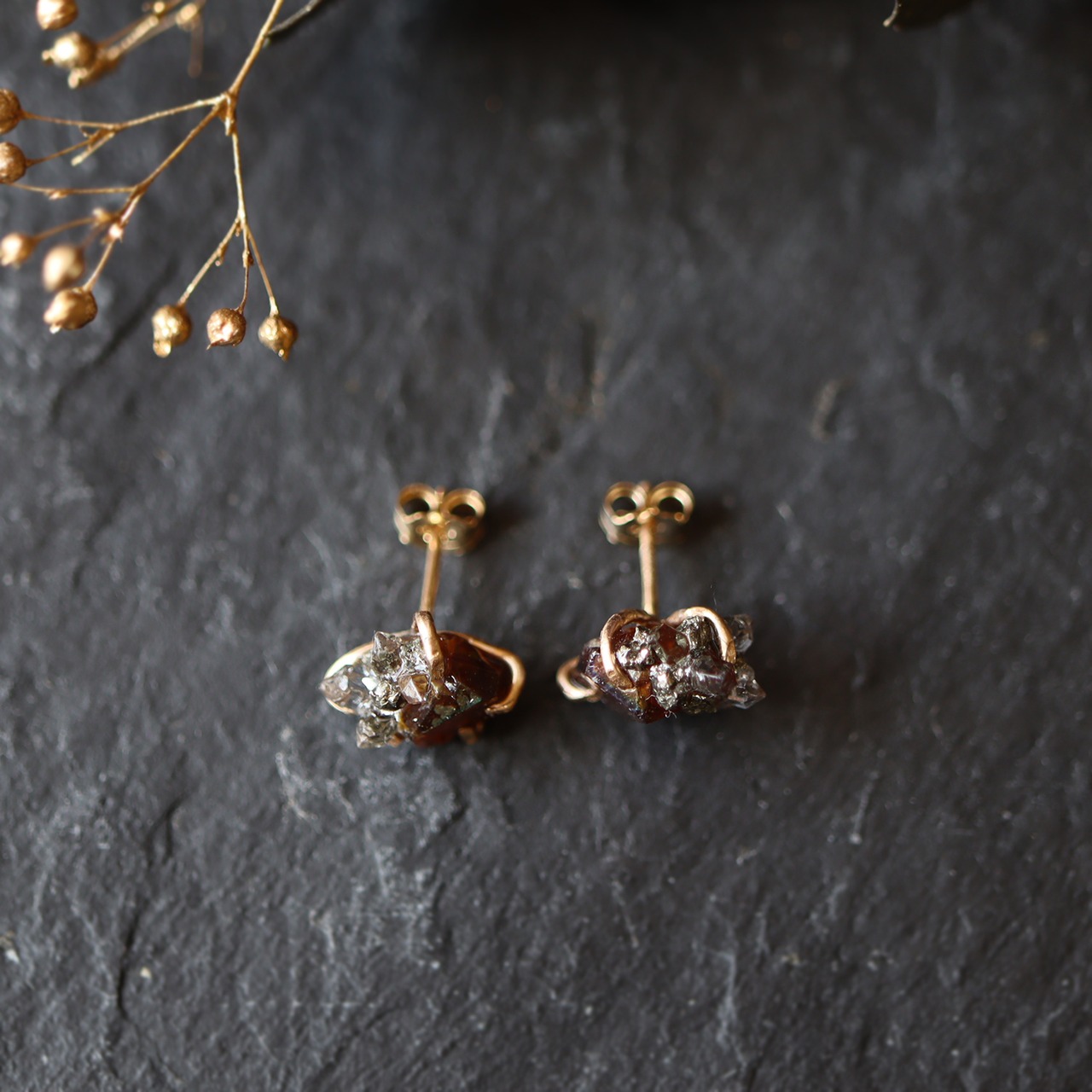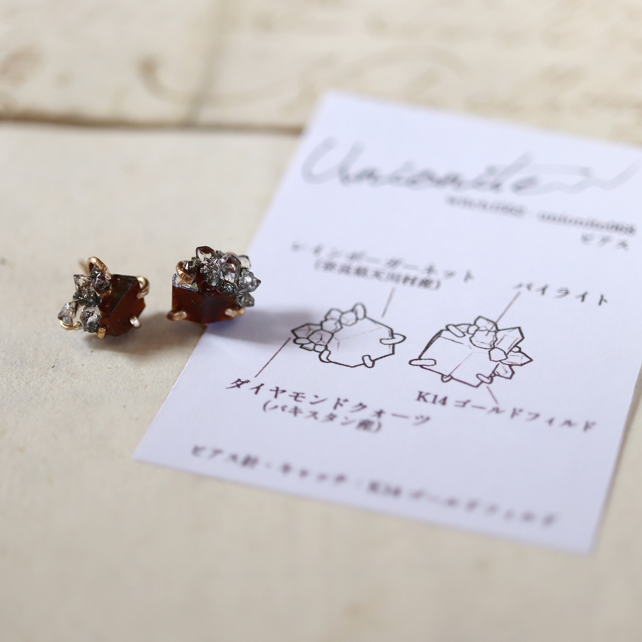 レインボーガーネットを母岩にダイヤモンドクォーツとパイライトが結晶した、創造上の鉱物「Unionite」のピアス。