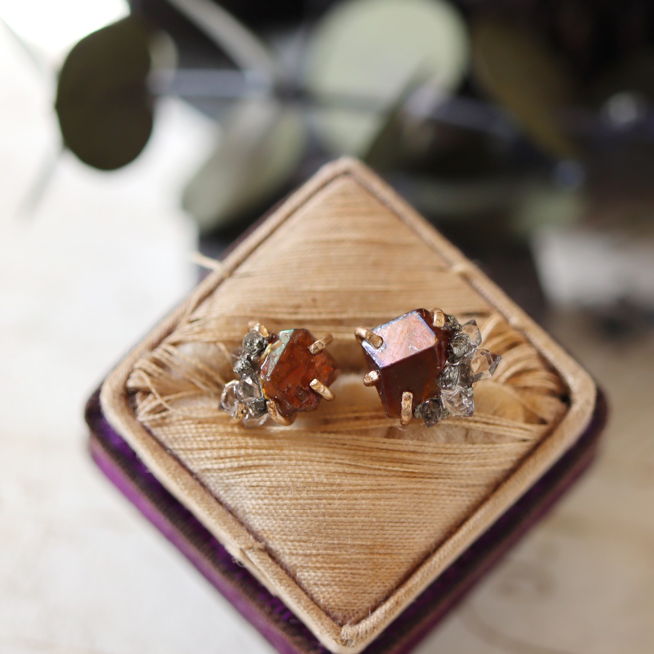 ころんと無骨な茶色のガーネットには、角度によって表面に虹色の光が浮かびます。ダイヤモンドクォーツとパイライトは、それぞれ結晶の幾何学的な形を残したまま、重なり合うように結晶を花開かせました。