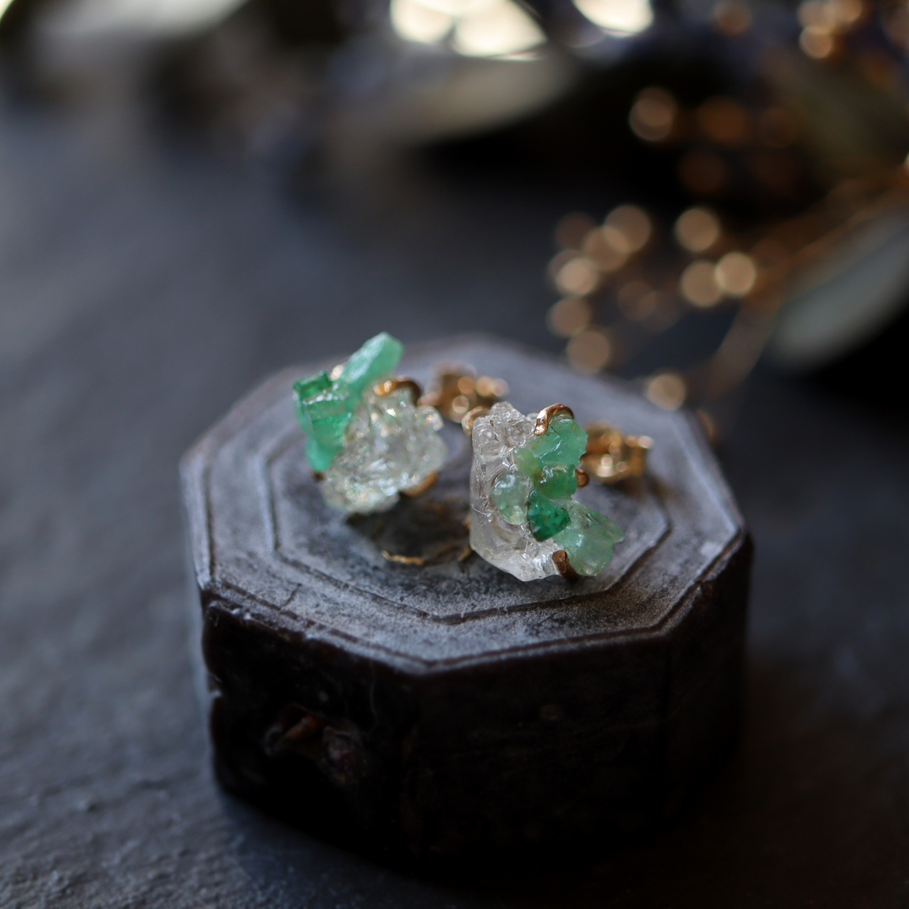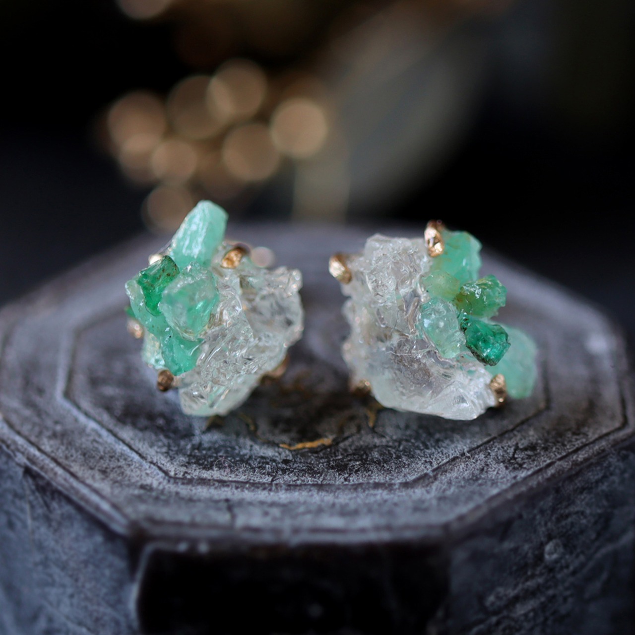 金色の爪で有機的に石を留めることで、鮮やかな色味とナチュラルな表情が引き立つピアスになりました。地球が生み出す芸術品のような原石を、ファッションとして楽しめるアイテム。使用した鉱物についての表記も同封しますので、プレゼントとしてもおすすめです。