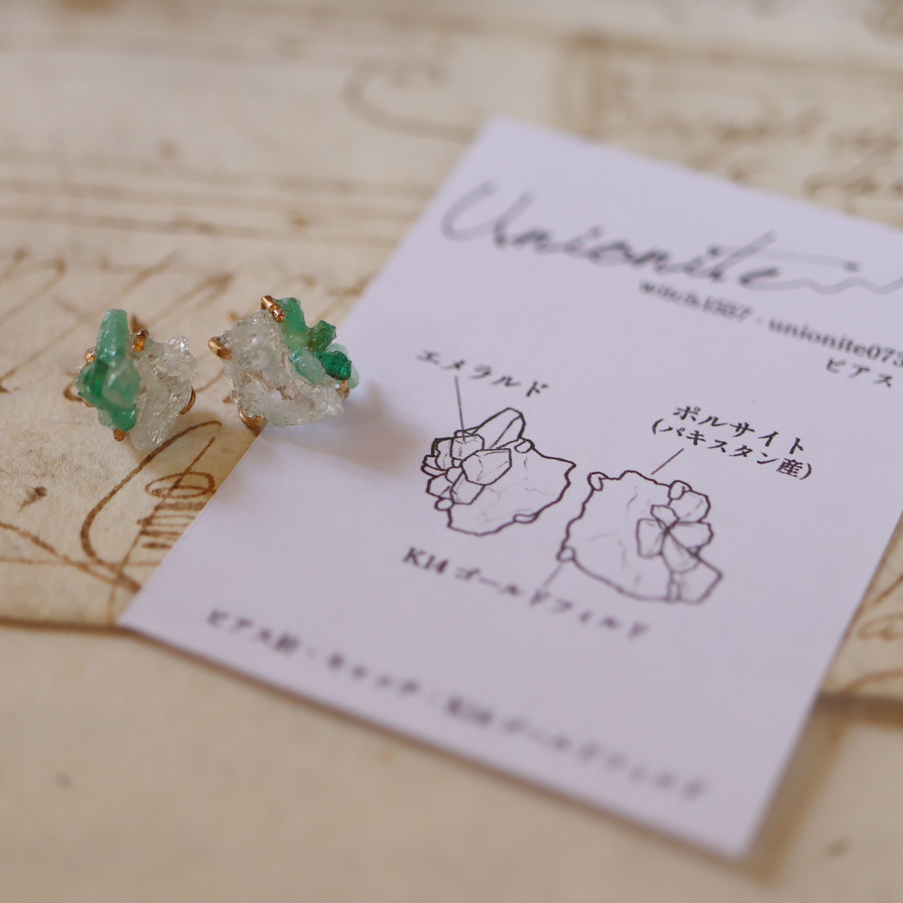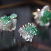 ポルサイトを母岩にエメラルドが結晶する、創造上の鉱物「Unionite」のピアス。