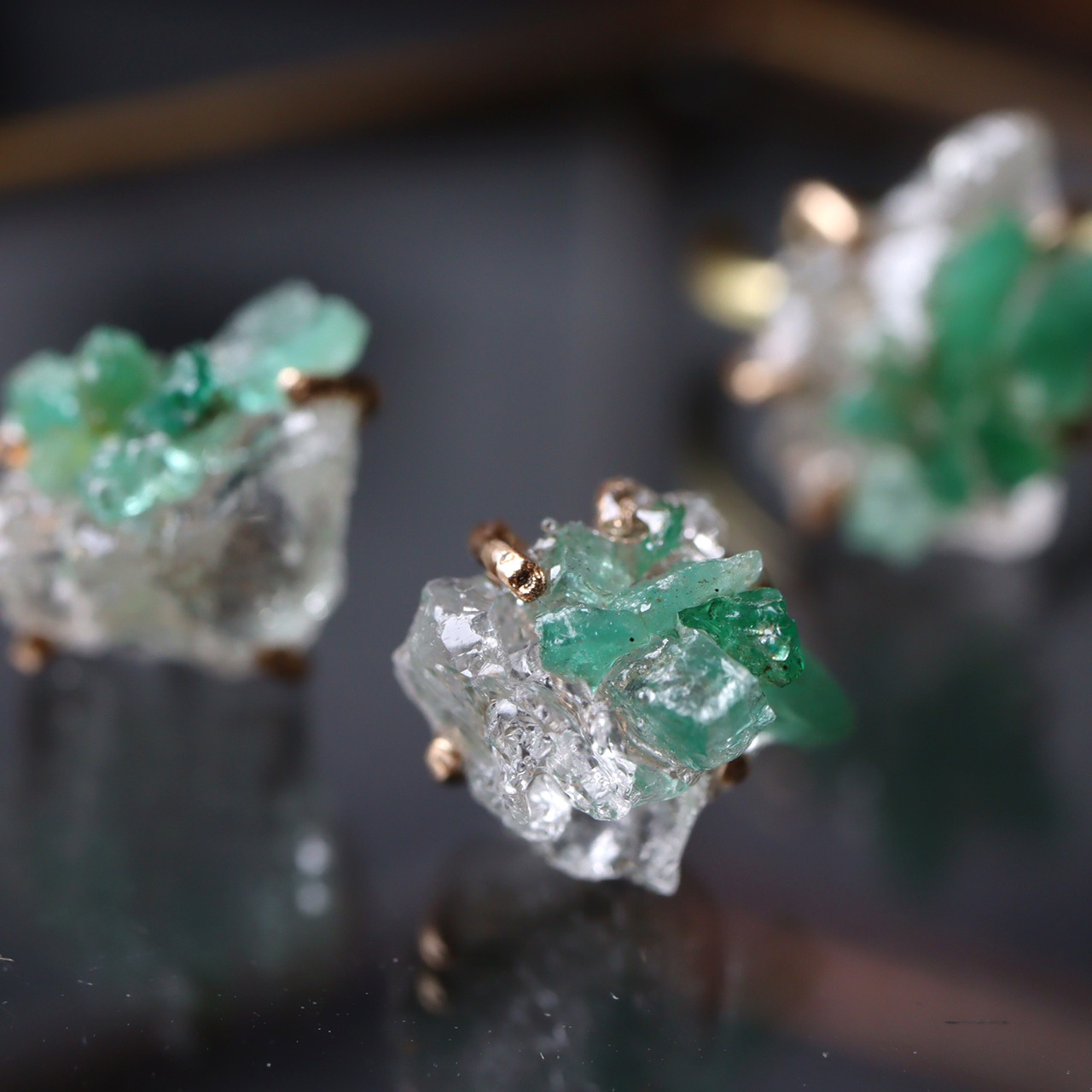 氷を切り出したような透明感、不思議な形状と内包物に光が反射してうるうると輝くポルサイト。エメラルドは濃淡のグリーンが美しい小さな原石の欠片を使用しました。