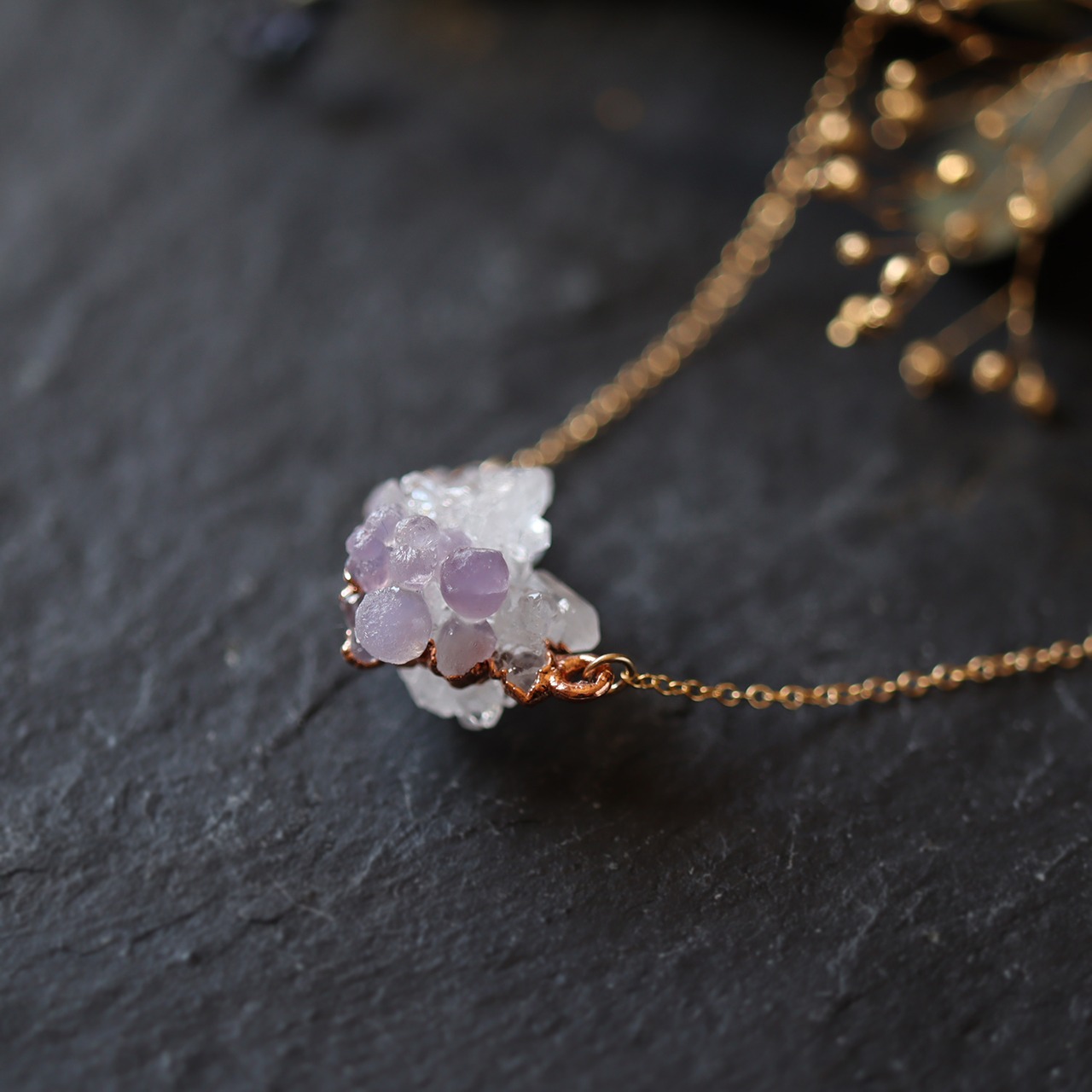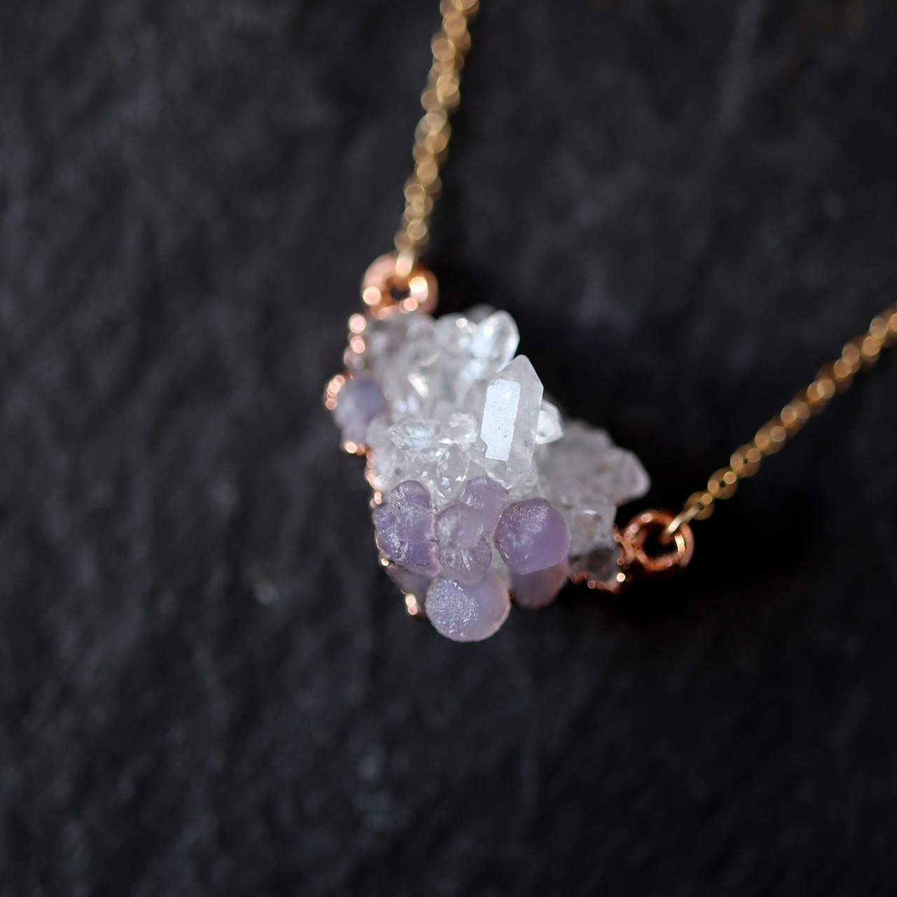 クォーツクラスターを母岩にグレープカルセドニが共生する、創造上の鉱物「Unionite」のネックレス。