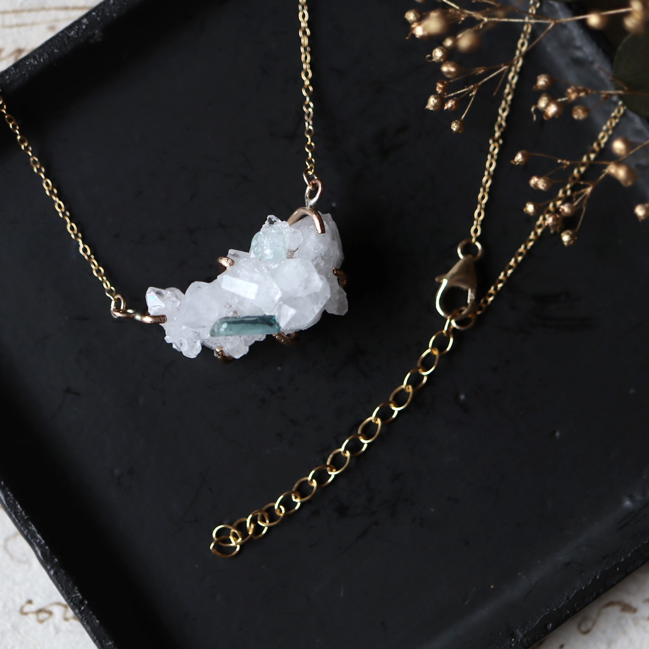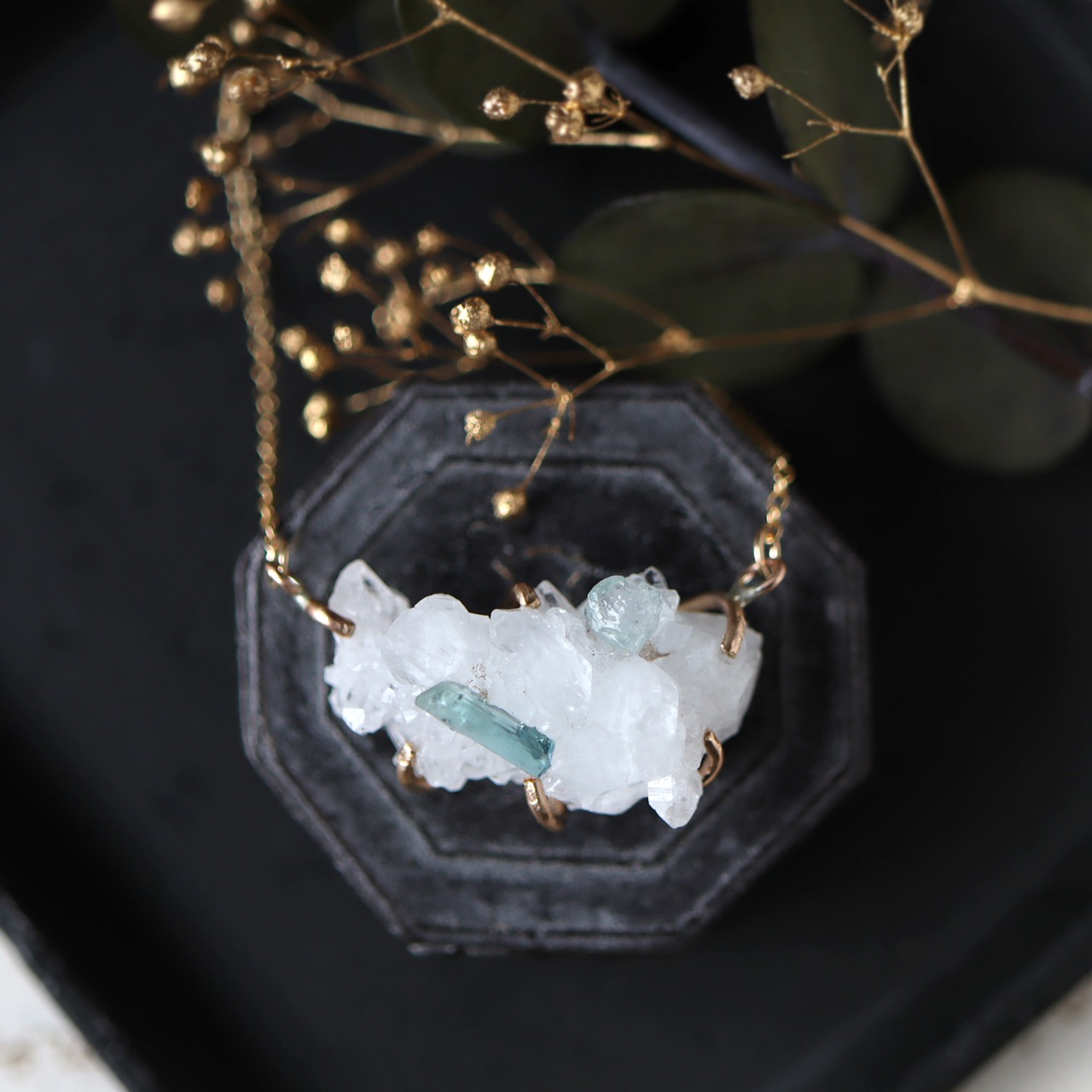 クォーツクラスターを母岩にトルマリンが共生する、 創造上の鉱物「Unionite」のネックレス。