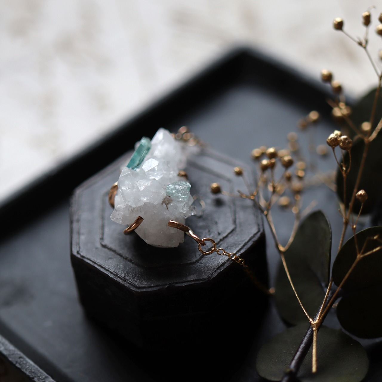 金色の爪で有機的に石を留めることで、光を最大限取り込み胸元できらきらと輝きます。地球が生み出す芸術品のような原石を、ファッションとして楽しめるアイテム。使用した鉱物についての表記も同封しますので、プレゼントとしてもおすすめです。