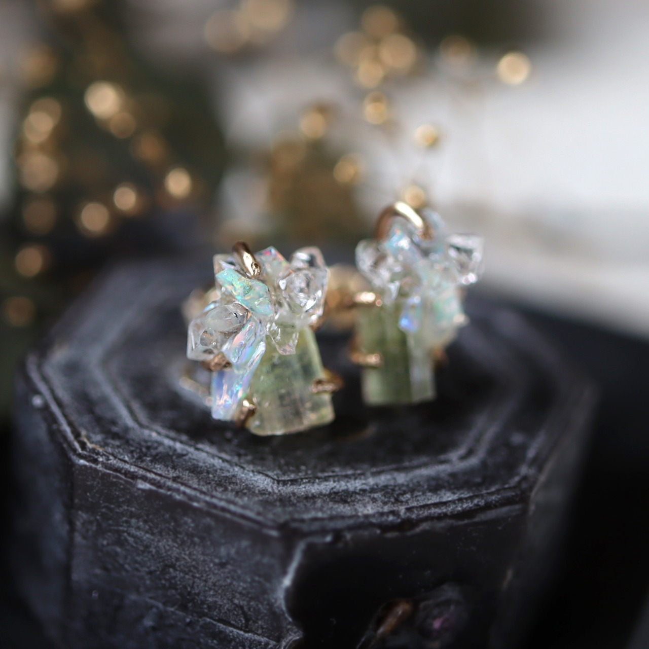 金色の爪で有機的に石を留めることで、光を最大限取り込み耳元できらきらと輝きます。地球が生み出す芸術品のような原石を、ファッションとして楽しめるアイテム。使用した鉱物についての表記も同封しますので、プレゼントとしてもおすすめです。