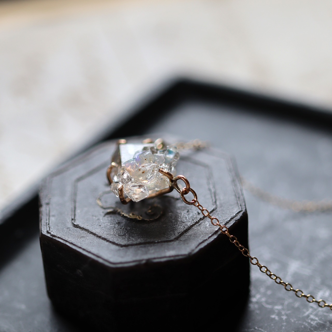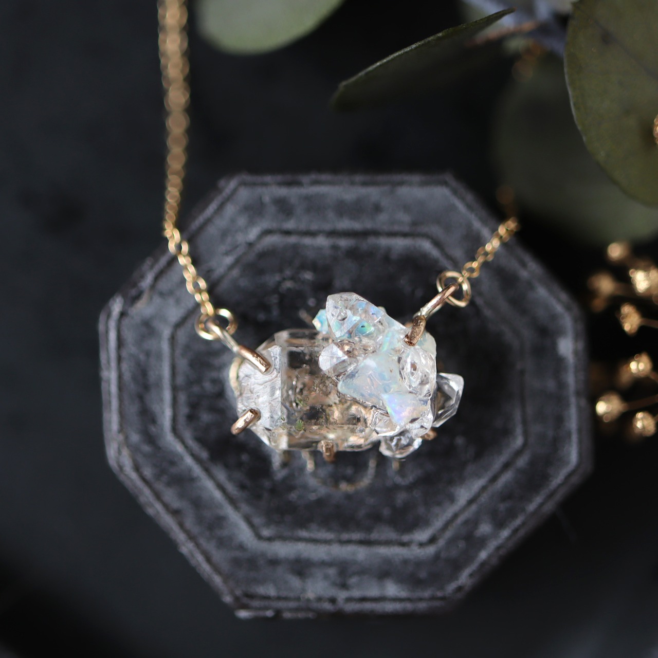 乳白色の中に虹色の光がゆらゆらと揺れるオパールと、結晶そのままの幾何学的な形、強い輝きと透明感が美しいダイヤモンドクォーツ。表情の違う鉱物の小さな結晶が複雑に重なり合い干渉することで、不思議な輝きを見せます。