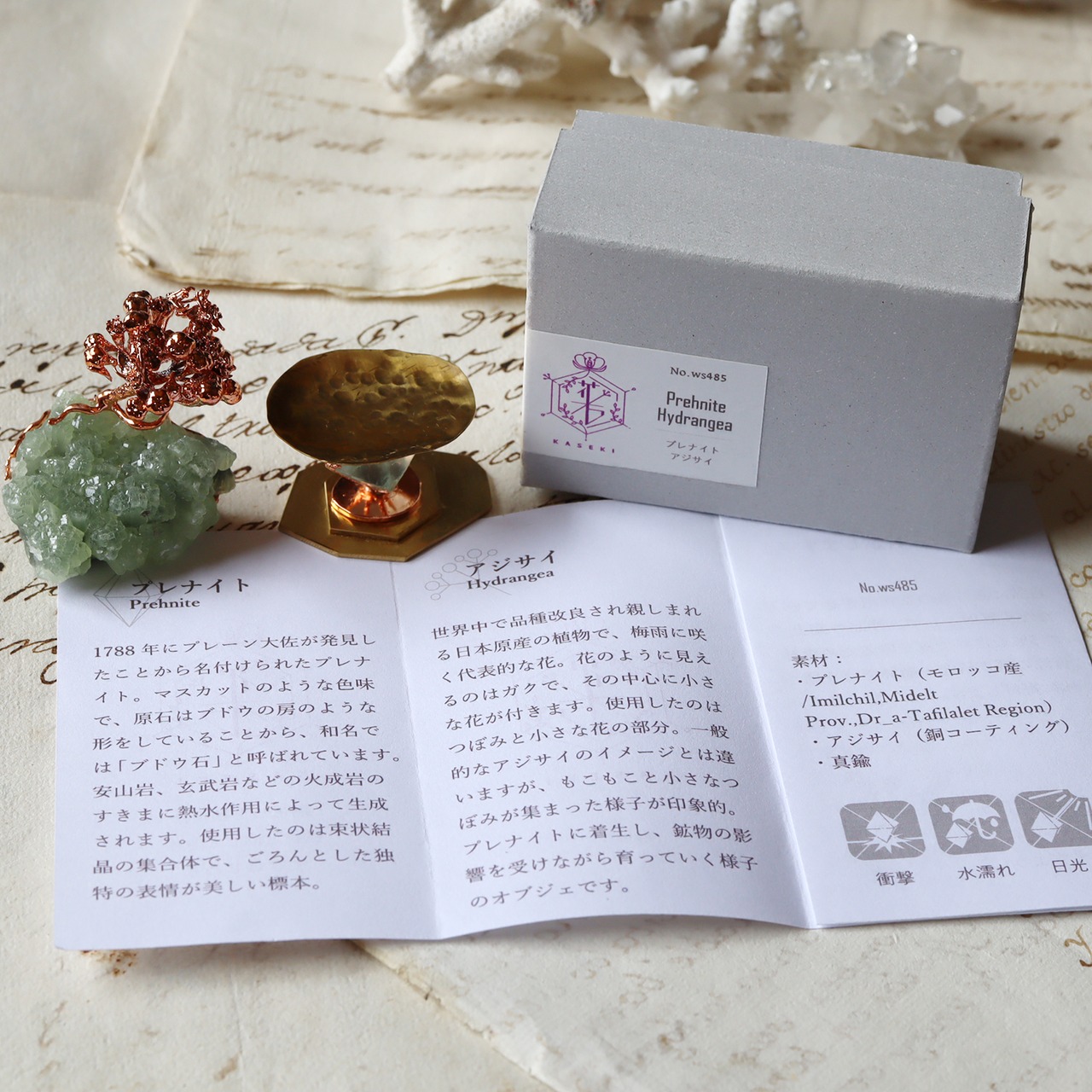 全ての作品にシリアルナンバーが付いており、オリジナルの箱と鉱物植物に関する説明書を同封します。