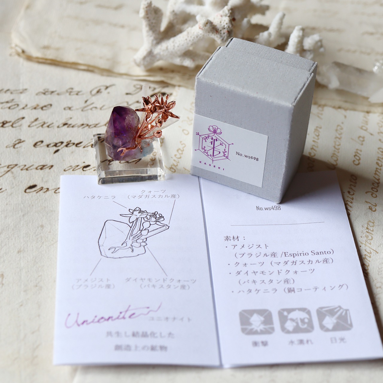 全ての作品にシリアルナンバーが付いており、オリジナルの箱と鉱物植物に関する説明書を同封します。