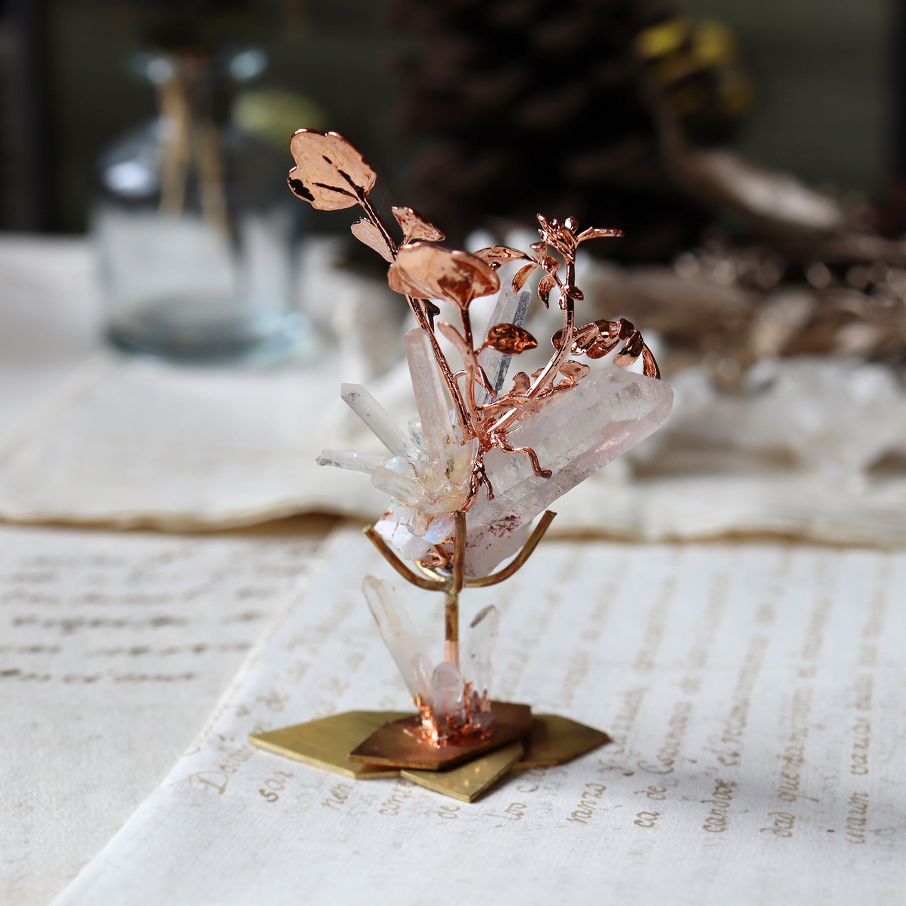 銅化した本物の植物と鉱物を使ったアートオブジェ。