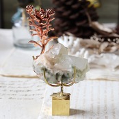 ベンケイソウ科の一属で、およそ35種を含む多肉植物。冬生育型の多肉植物の代表的な存在です。使用したのは、「小人の祭り」と「サンデルシー」の交配とされる「小人の花束」という種。葉の根元から新しい茎が伸びる独特の造形。結晶の隙間に着生し、根っこで鉱物を抱えながら養分を得て育っていく様子のオブジェです。真鍮の専用スタンドに飾って楽しんでください。