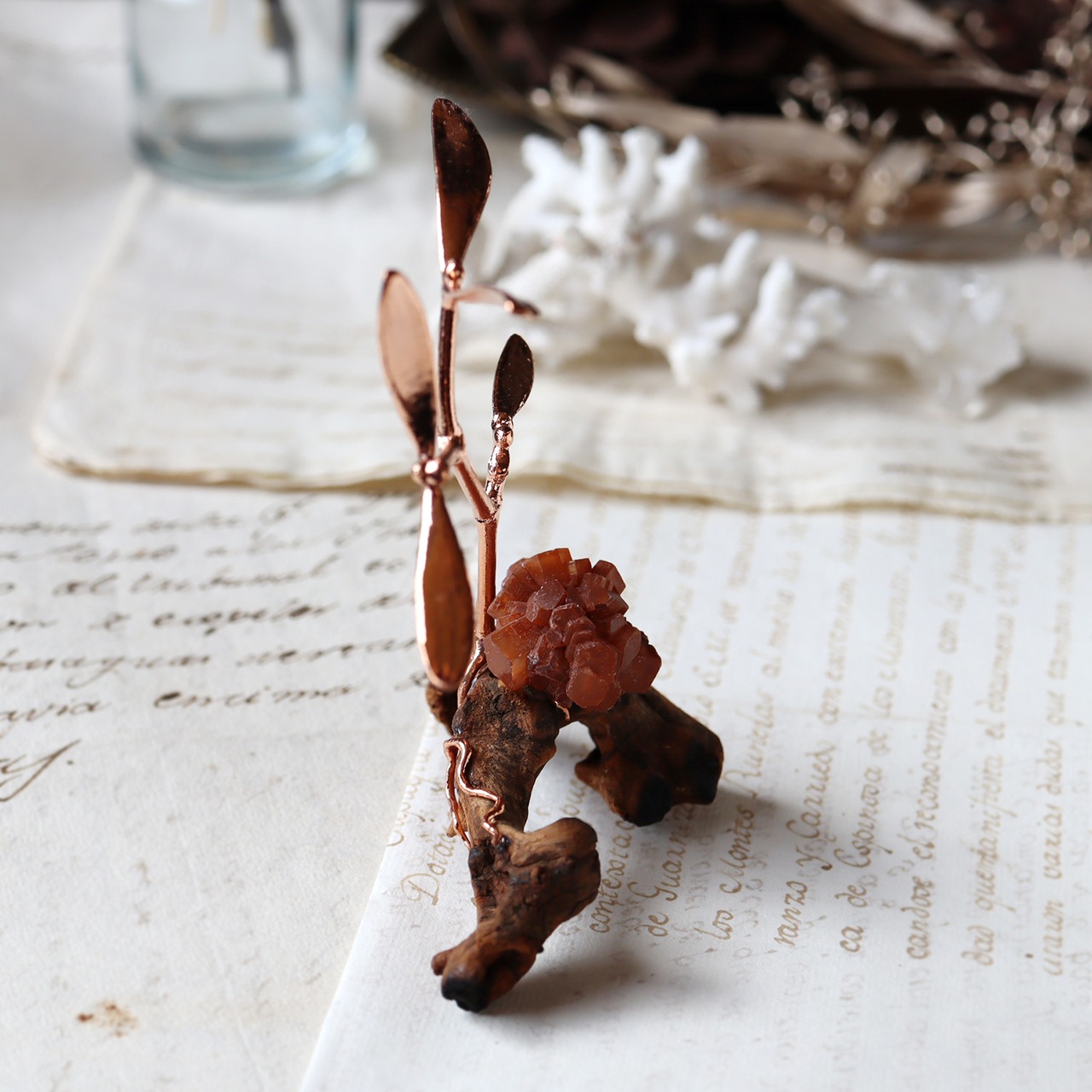 素材:アラゴナイト(モロッコ産)・ヤドリギ(銅コーティング)・流木