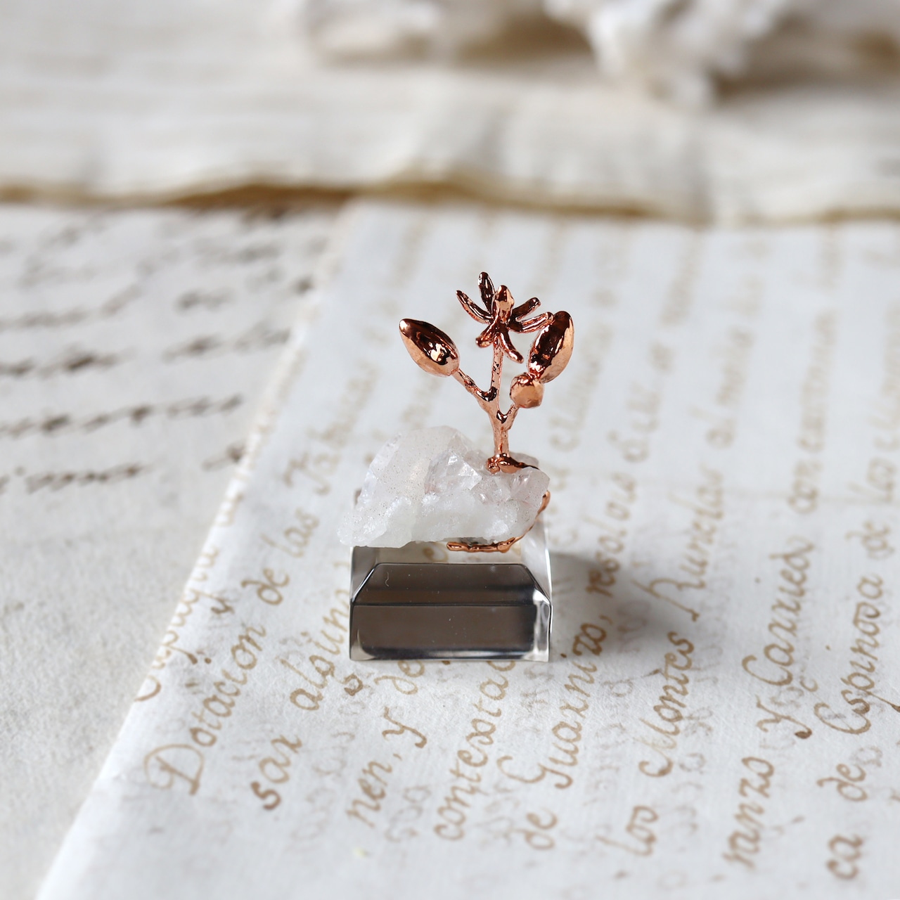 銅化した本物の植物と鉱物を使ったアートオブジェ。
