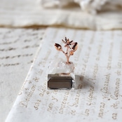 ギリシャ語で「葉のように簡単に剥がれる」という意味から名付けられた石。その名の通りとても脆く衝撃により簡単に割れてしまいます。石の表面の輝きが魚の目に似ていることから和名では「魚眼石」とも呼ばれます。使用したのは、幾何学的な結晶がいくつも集まった美しい標本。透明感や結晶内部が透ける様子も楽しめる、砂糖菓子のようなかわいい表情です。