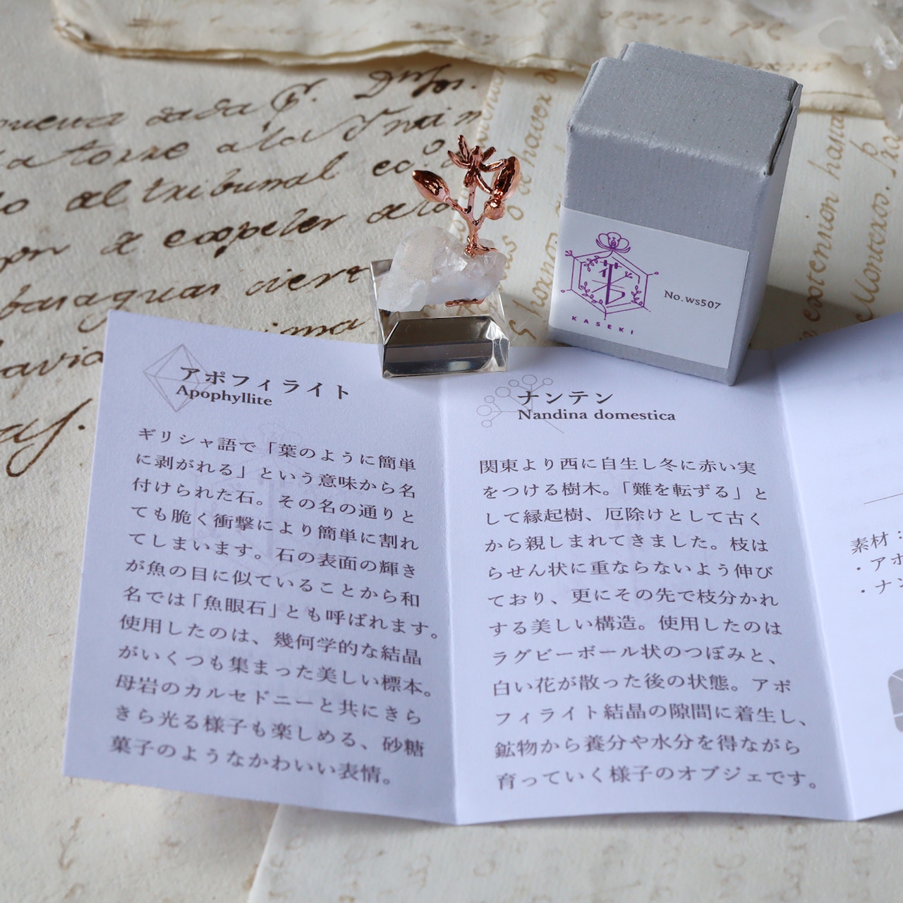全ての作品にシリアルナンバーが付いており、オリジナルの箱と鉱物植物に関する説明書を同封します。
