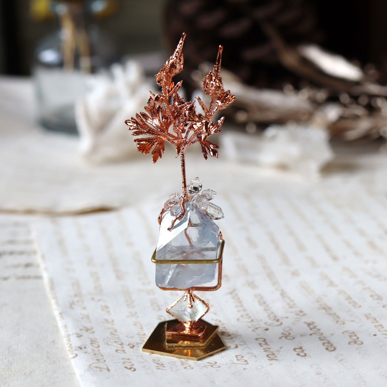 銅化した本物の植物と鉱物を使ったアートオブジェ。