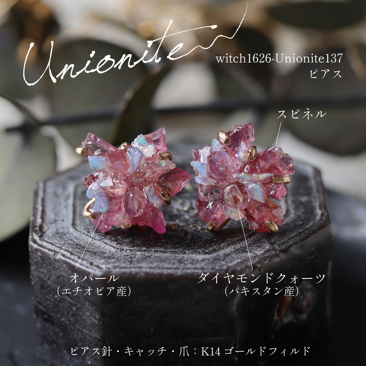 素材:スピネル・オパール(エチオピア産)・ダイヤモンドクォーツ(パキスタン産)・K14ゴールドフィルド(ピアス爪・針・キャッチ)