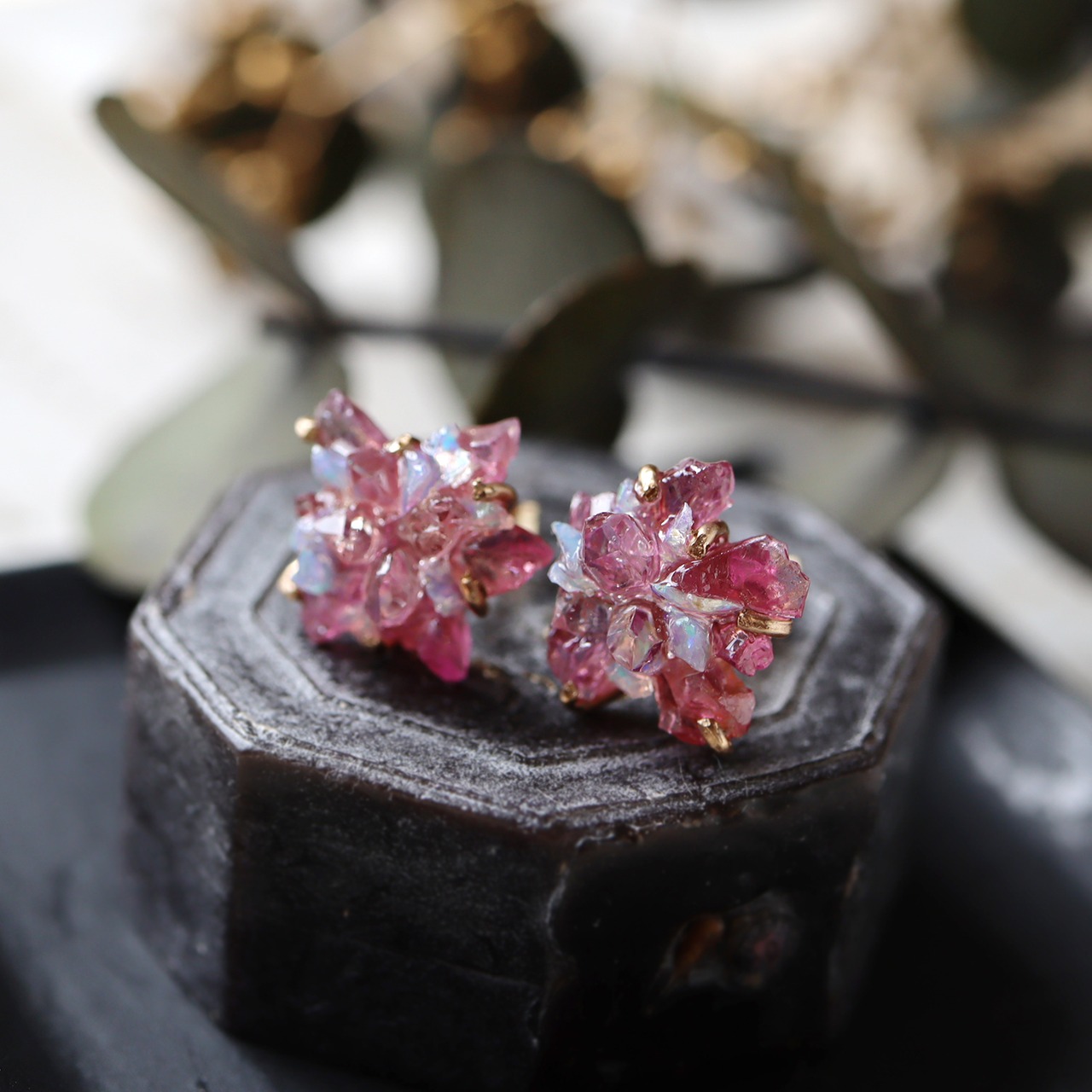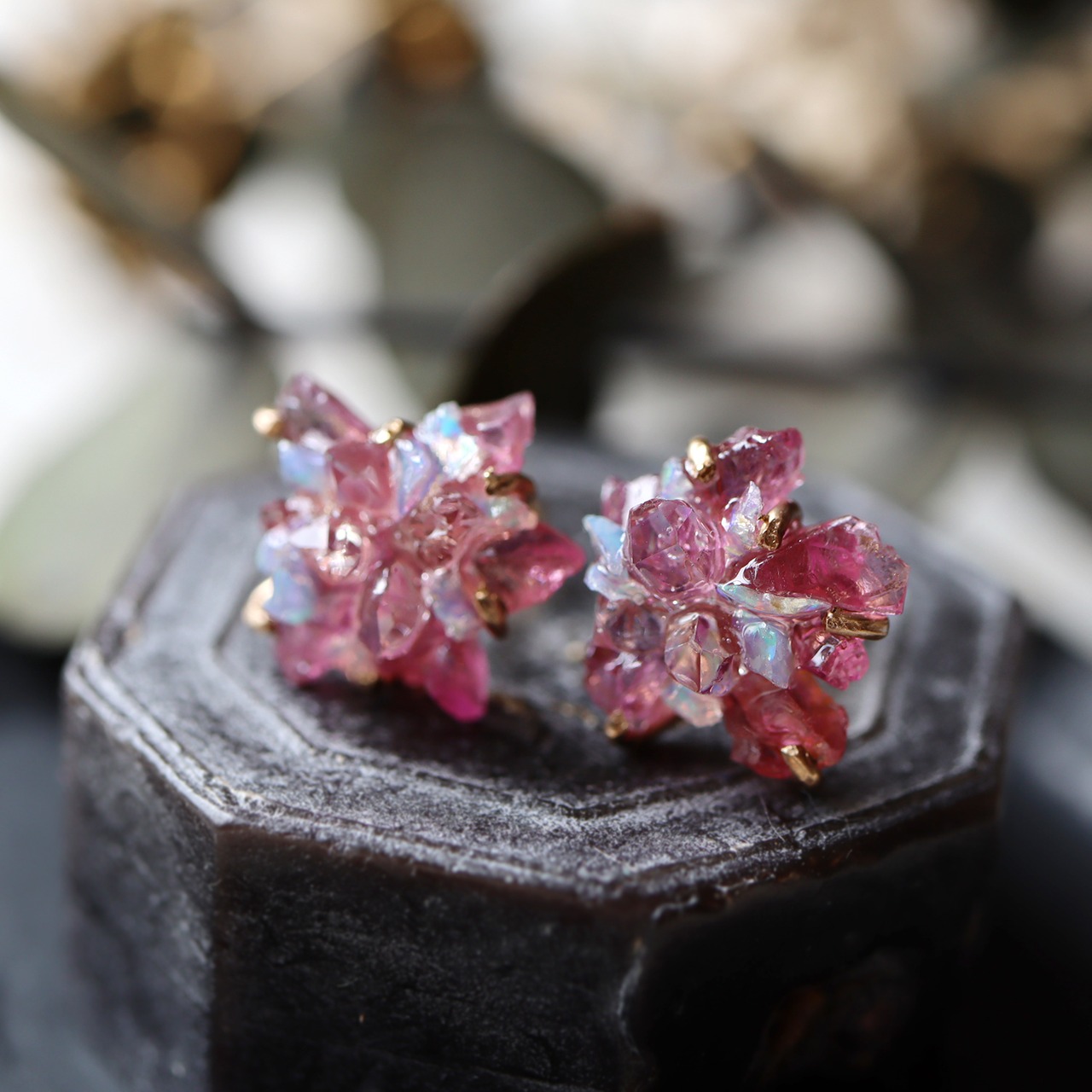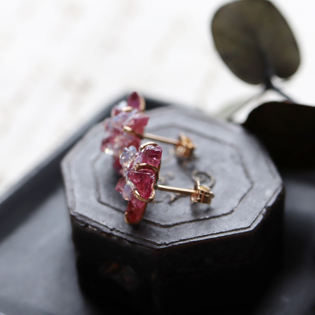 鮮やかなピンク色のスピネルと、乳白色に虹色の遊色が浮かぶオパール、原石そのままの形と強い輝きが美しいダイヤモンドクォーツ。表情の違う鉱物の小さな結晶が複雑に重なり合い干渉することで、不思議な輝きを見せてくれます。
