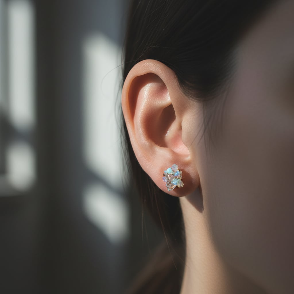 オパールとダイヤモンドクォーツが共生し結晶化した、創造上の鉱物「Unionite」のピアス。