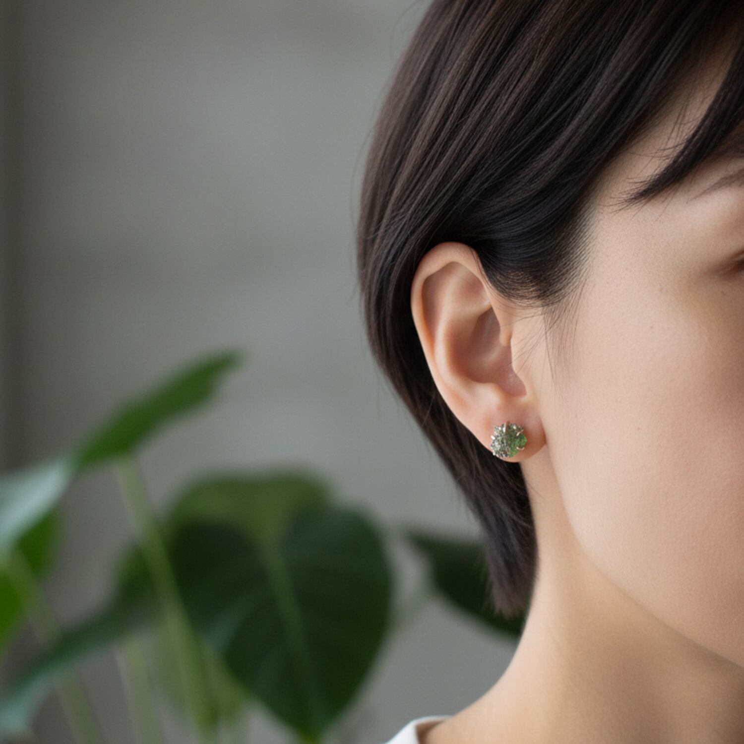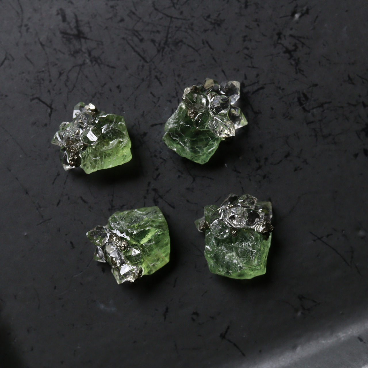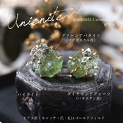 グリーンアパタイトを母岩にダイヤモンドクォーツとパイライトが共生する、創造上の鉱物「Unionite」のピアス。