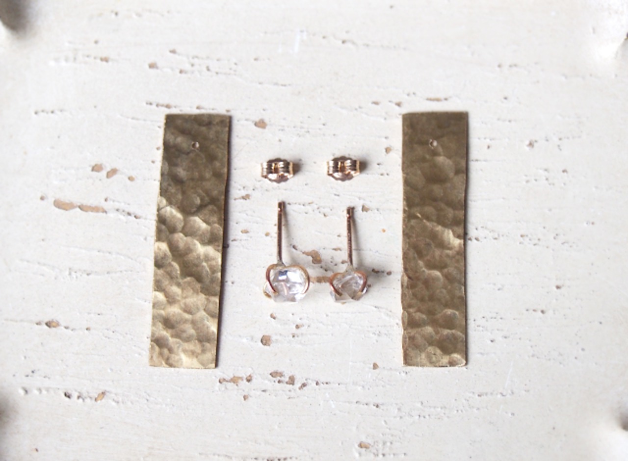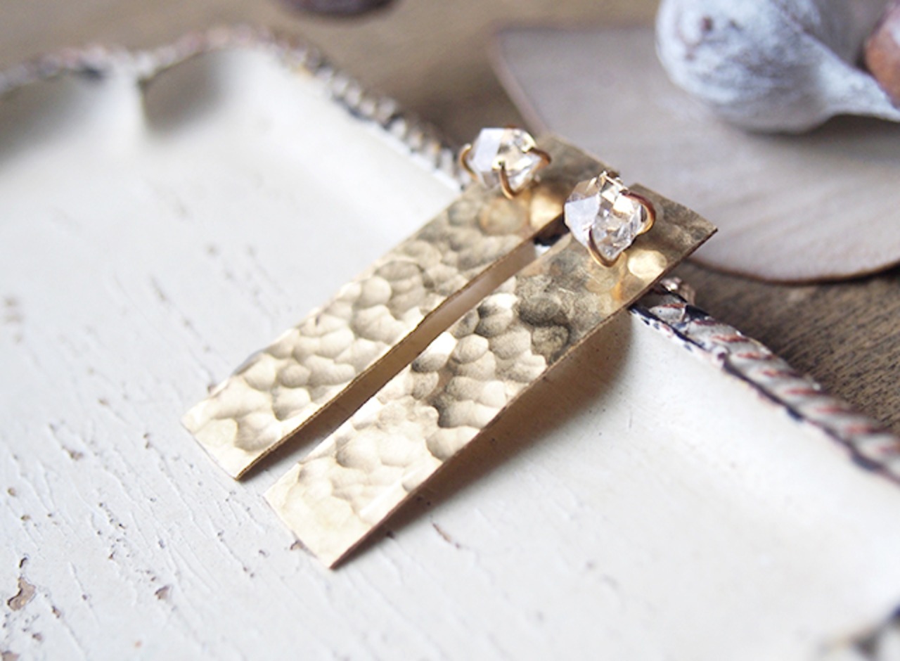 原石のハーキマーダイヤモンドと真鍮の四角ピアス