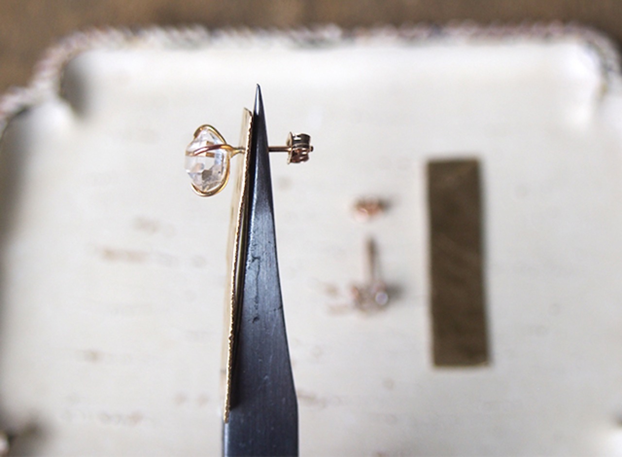 四角形のパーツは取り外し可能なので、原石ピアスのみで使っても、他のピアスと組み合わせてもOK。使い回しのきく万能ピアスです。