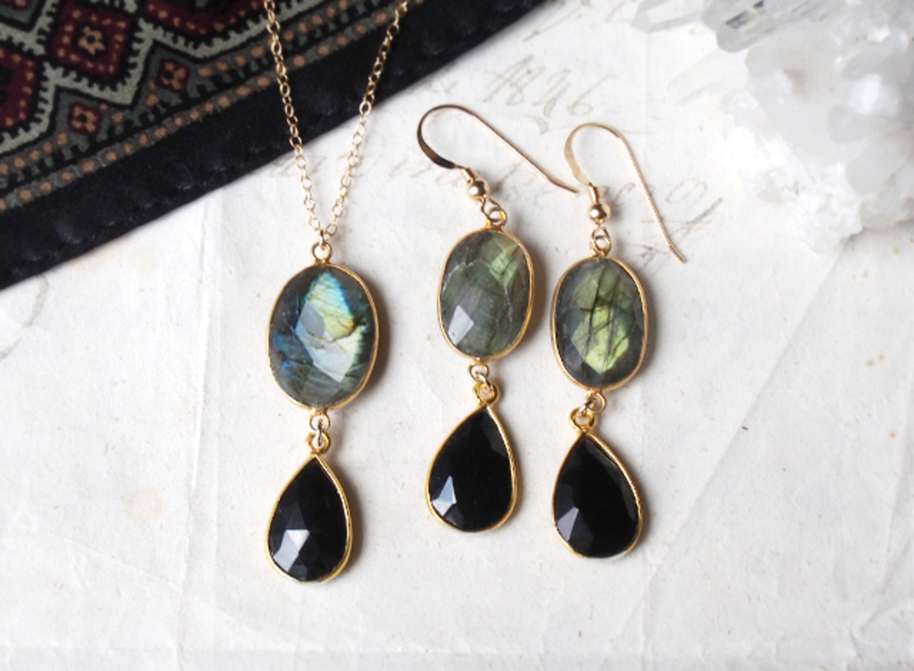 グレーの中に神秘的な光が浮かぶラブラドライトと、艶のある漆黒のオニキス。