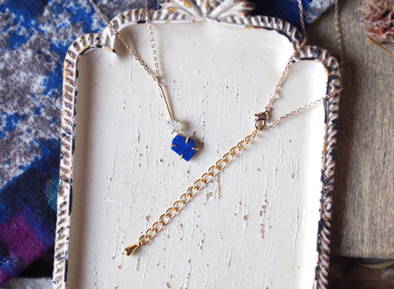 胸元から天然石の雫がしたたり落ちるような、印象的なアイテムです。