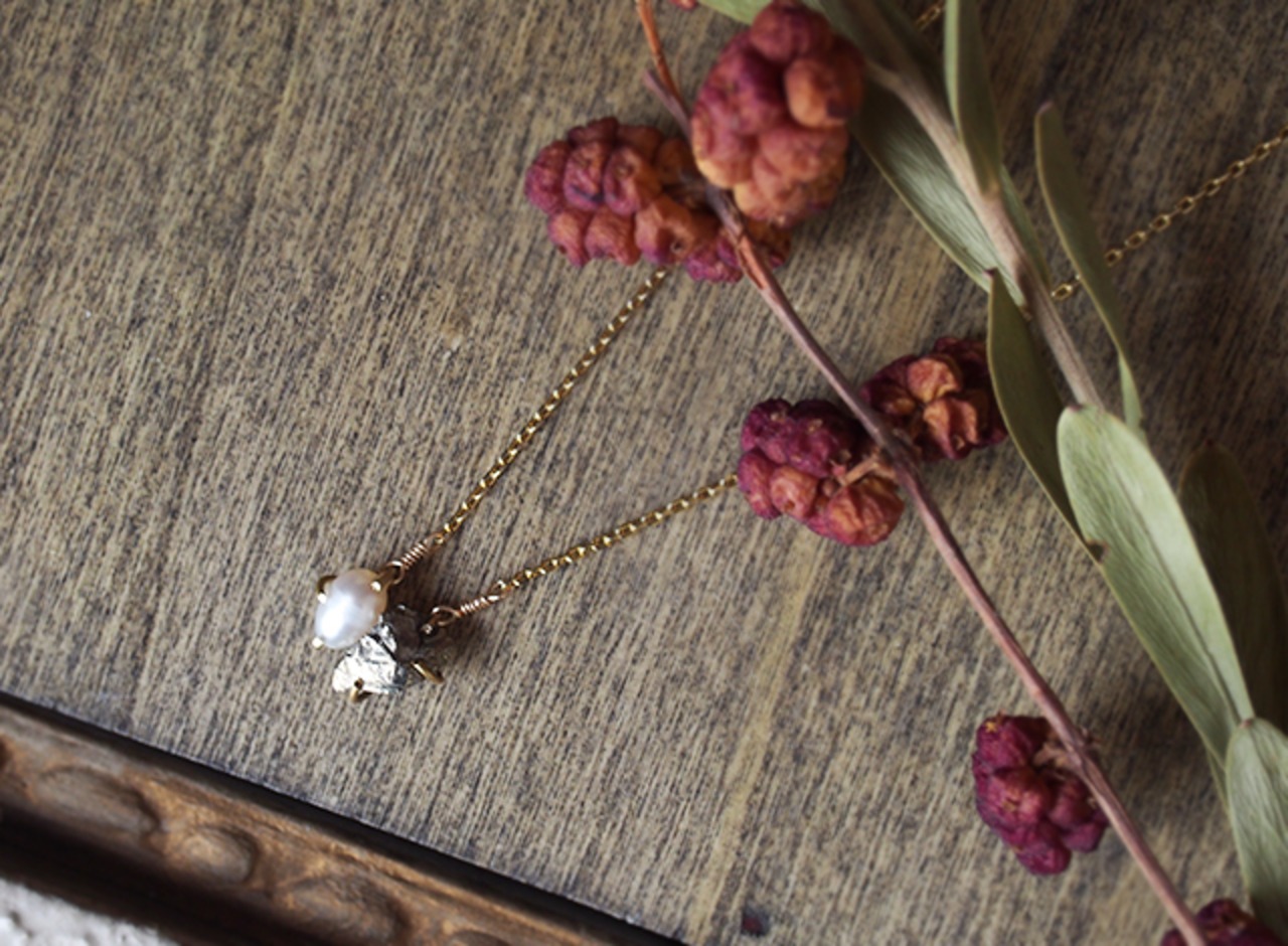 鉱物や原石らしいナチュラルな質感と、整いすぎない自然な丸みのパールを合わせ、ラフなネックレスにしました。