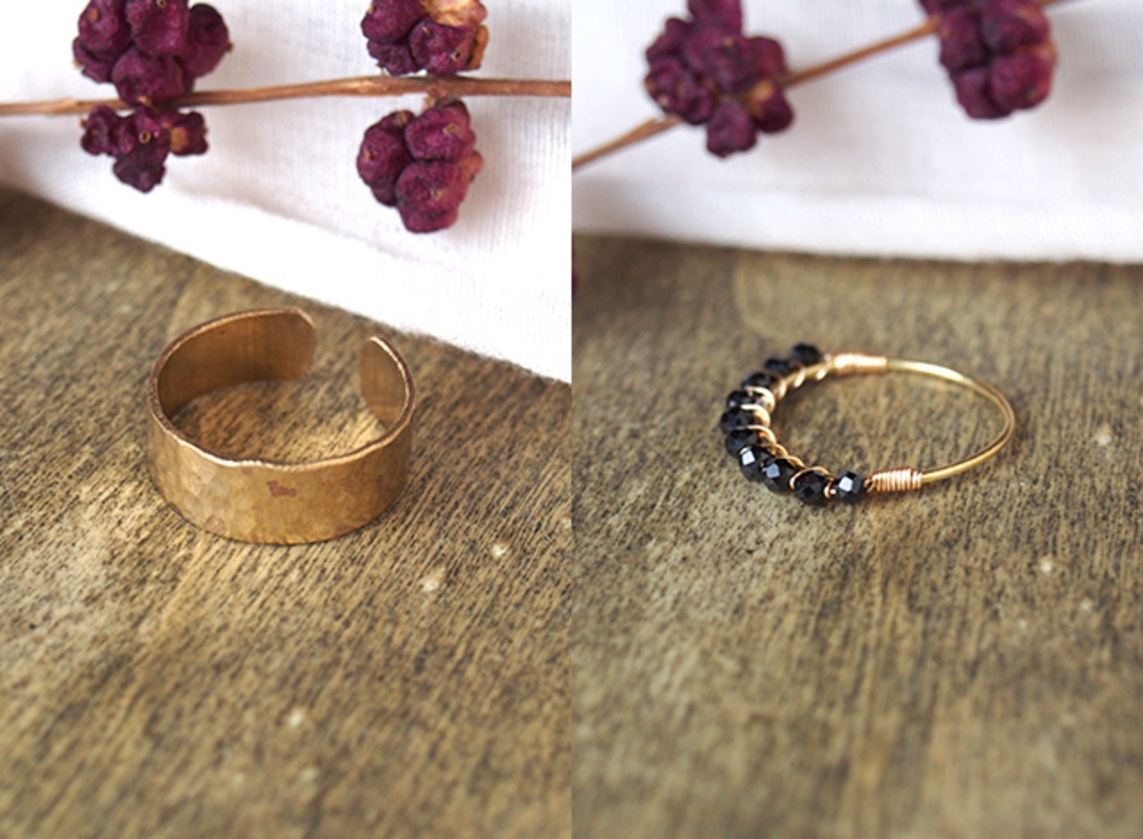 槌目(つちめ)と呼ばれるテクスチャがあたたかい質感の真鍮リングと、艶のある黒が美しいブラックスピネルのリング。