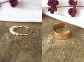 槌目(つちめ)と呼ばれるテクスチャがあたたかい質感の真鍮リングと、上品な輝きが美しいベビーパールのリング。