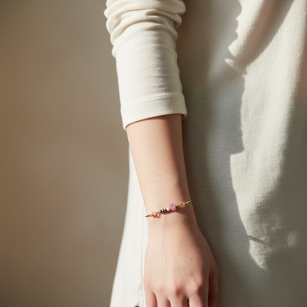 落ち着いたピンク、原石らしい表情のトルマリンと、上品な輝きのパール、独特の金属光沢のパイライト。