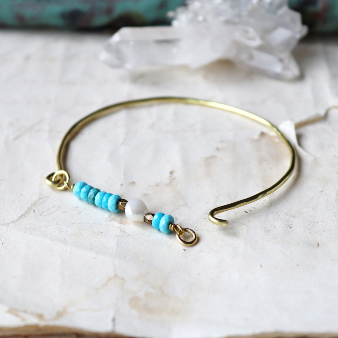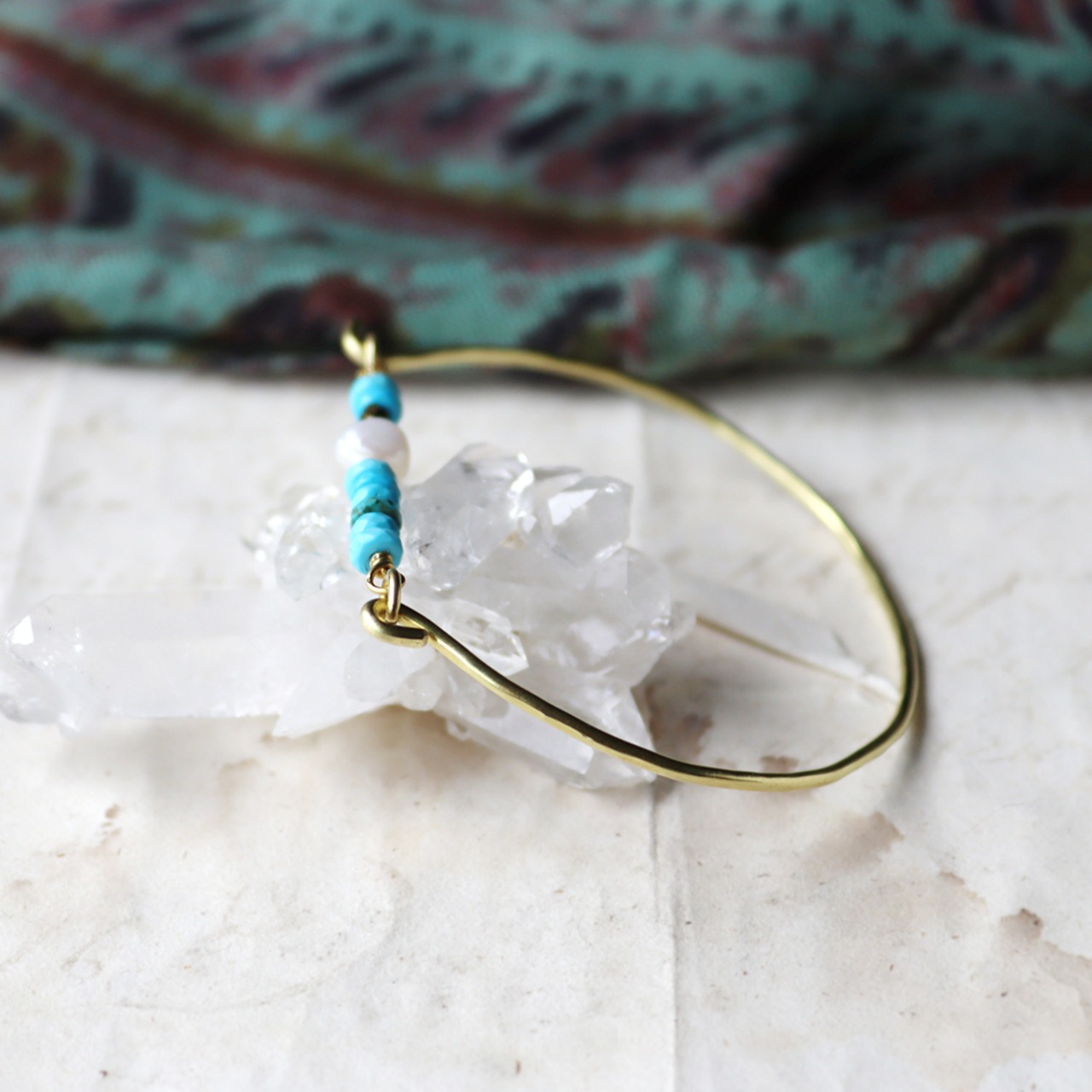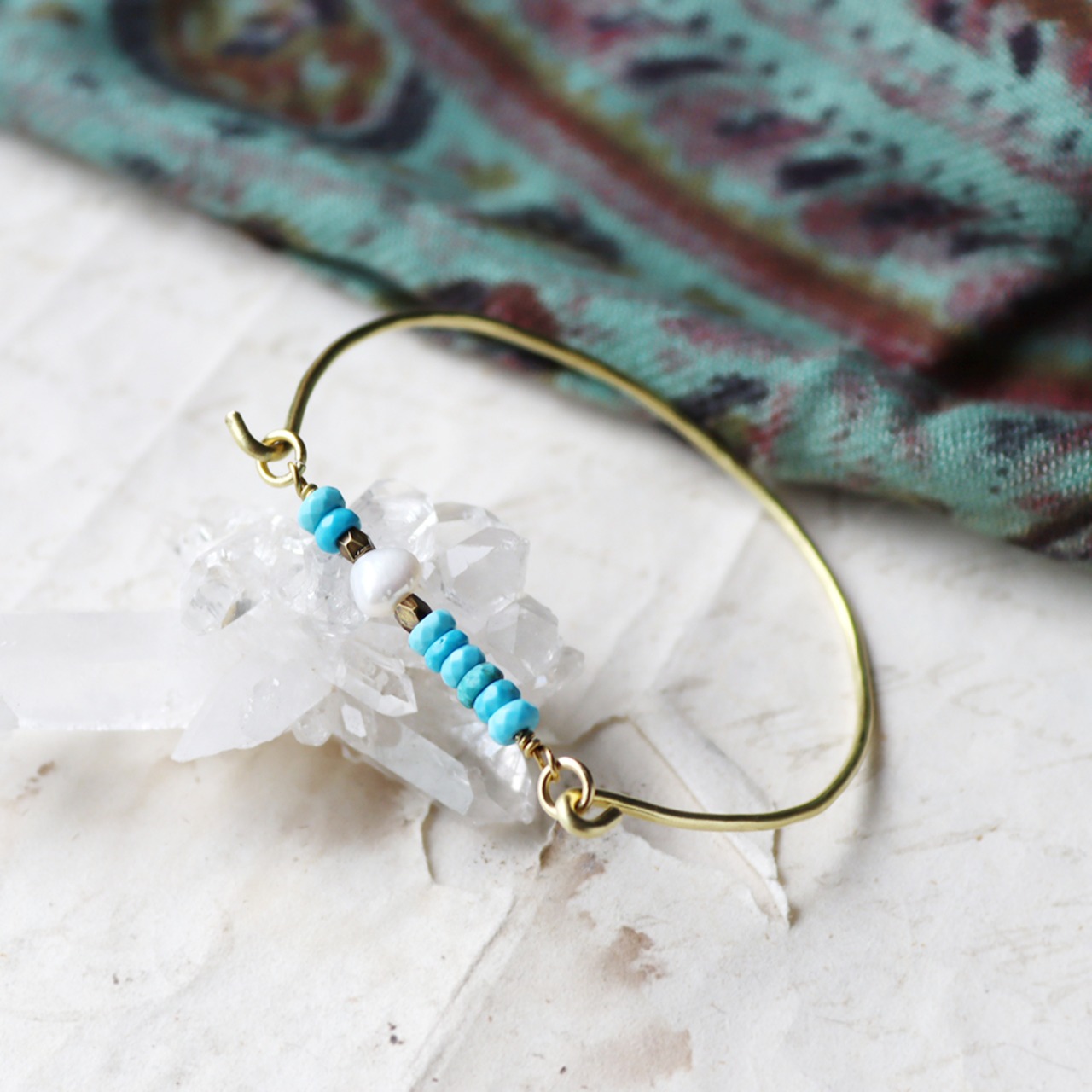 ターコイズとパールの真鍮バングル