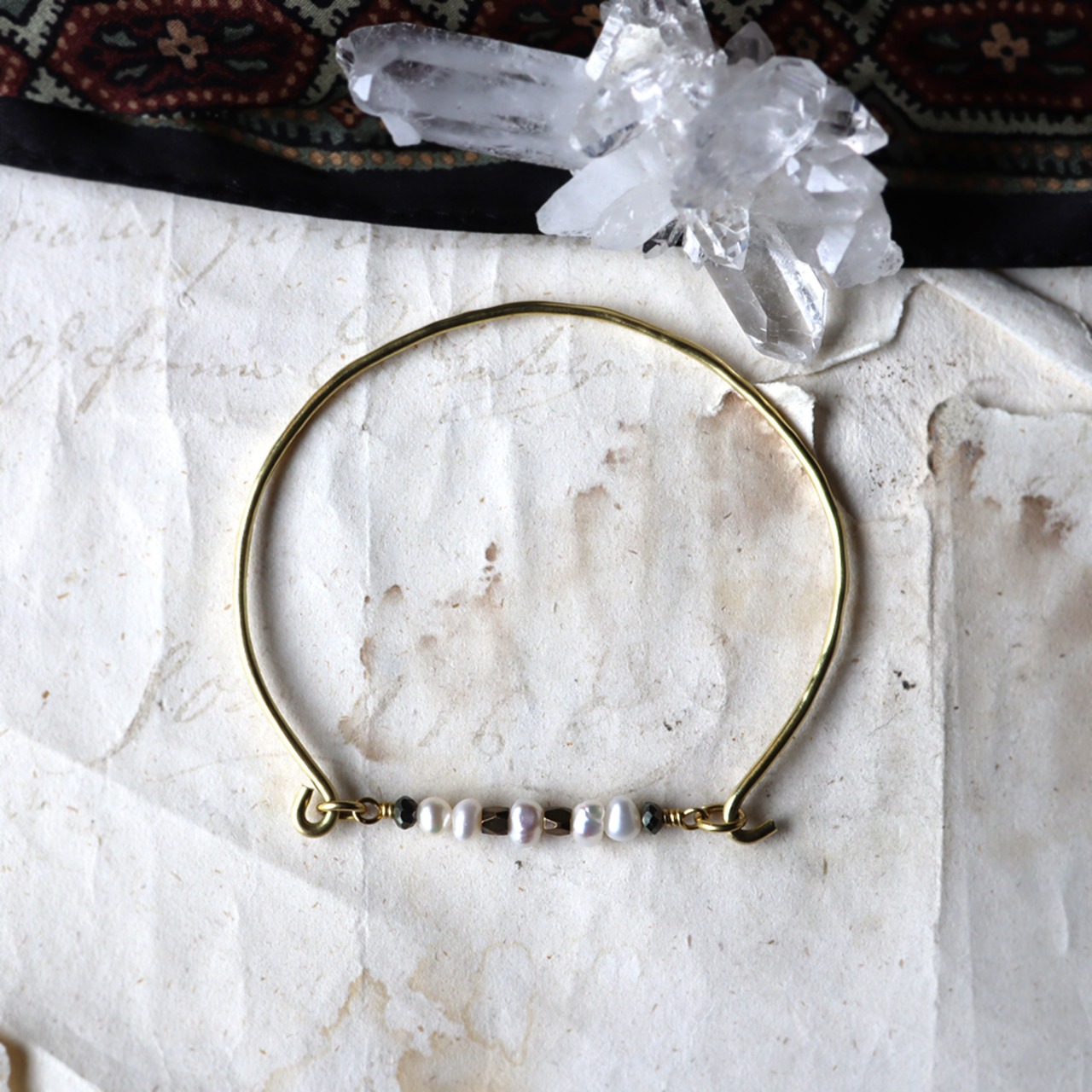 艶っぽい天然石をあたたかいゴールド色の真鍮と合わせ、シンプルなバングルにしました。