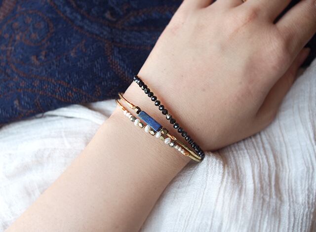 重ね着けバングル-ラピスラズリ・ブラックスピネル・パールとパイライト
