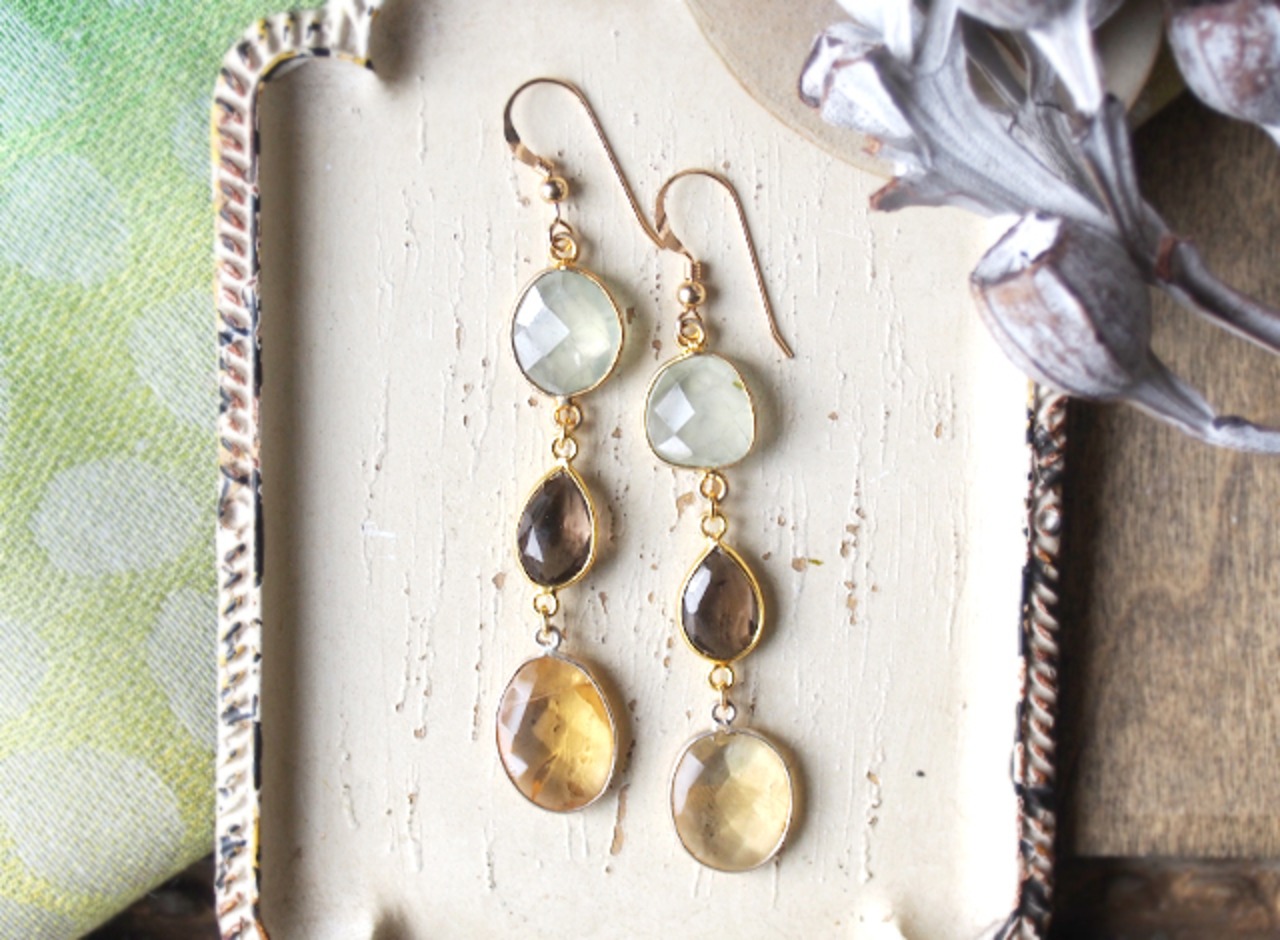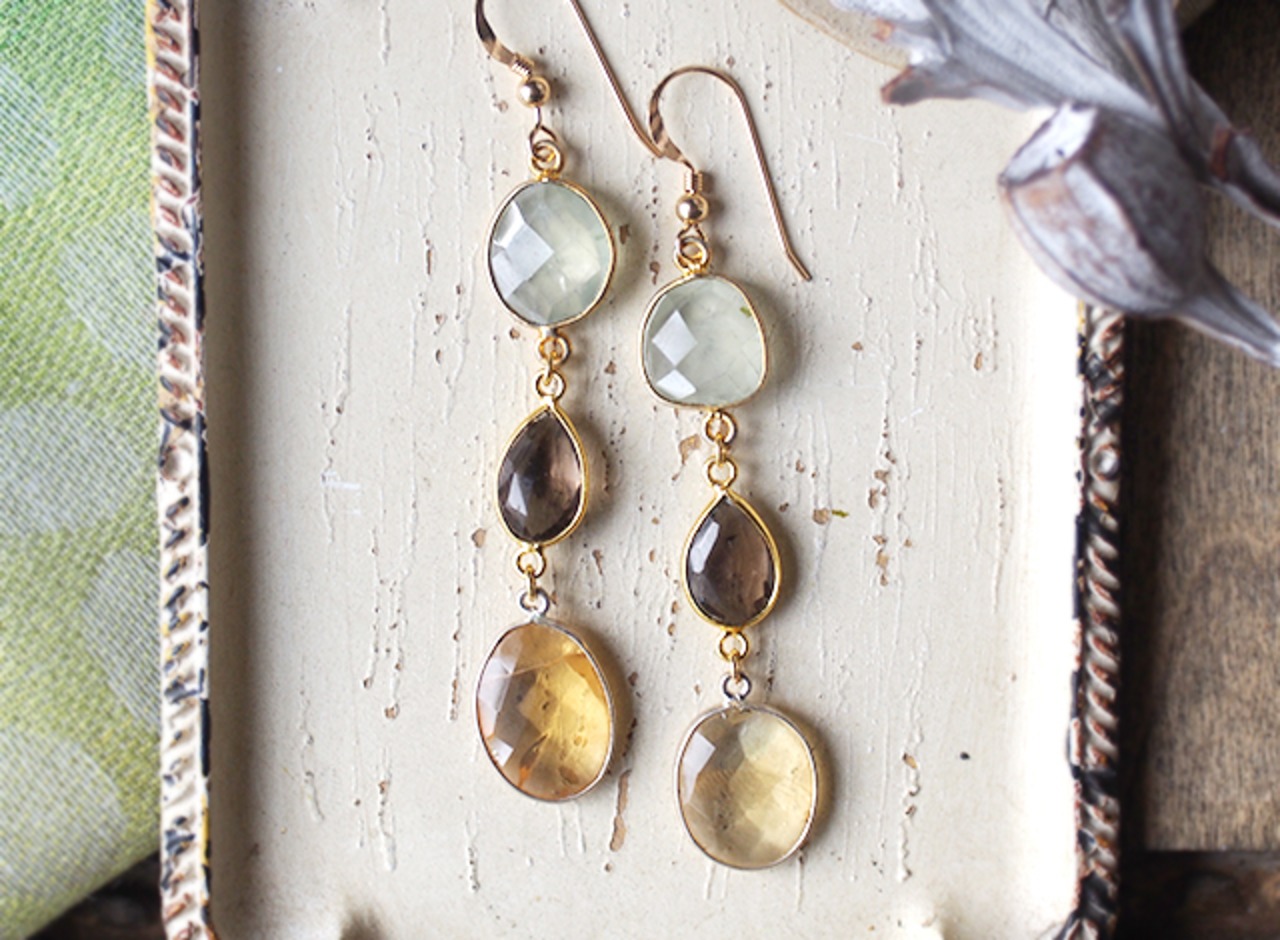 柔らかいライムグリーンのプレーナイト、落ち着いたブラウンのスモーキークォーツ、蜂蜜のように甘いイエローのシトリン。