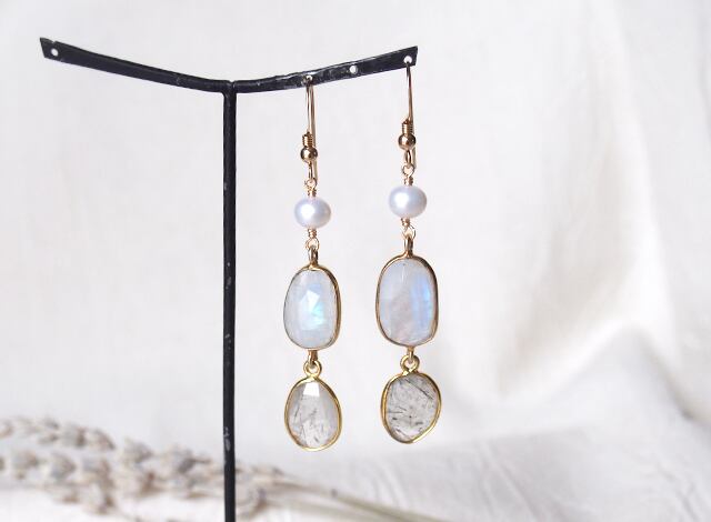 素材:パール・ロイヤルブルームーンストーン・トルマライズクォーツ・シルバー(石枠/ゴールドプレート)・K14ゴールドフィルド